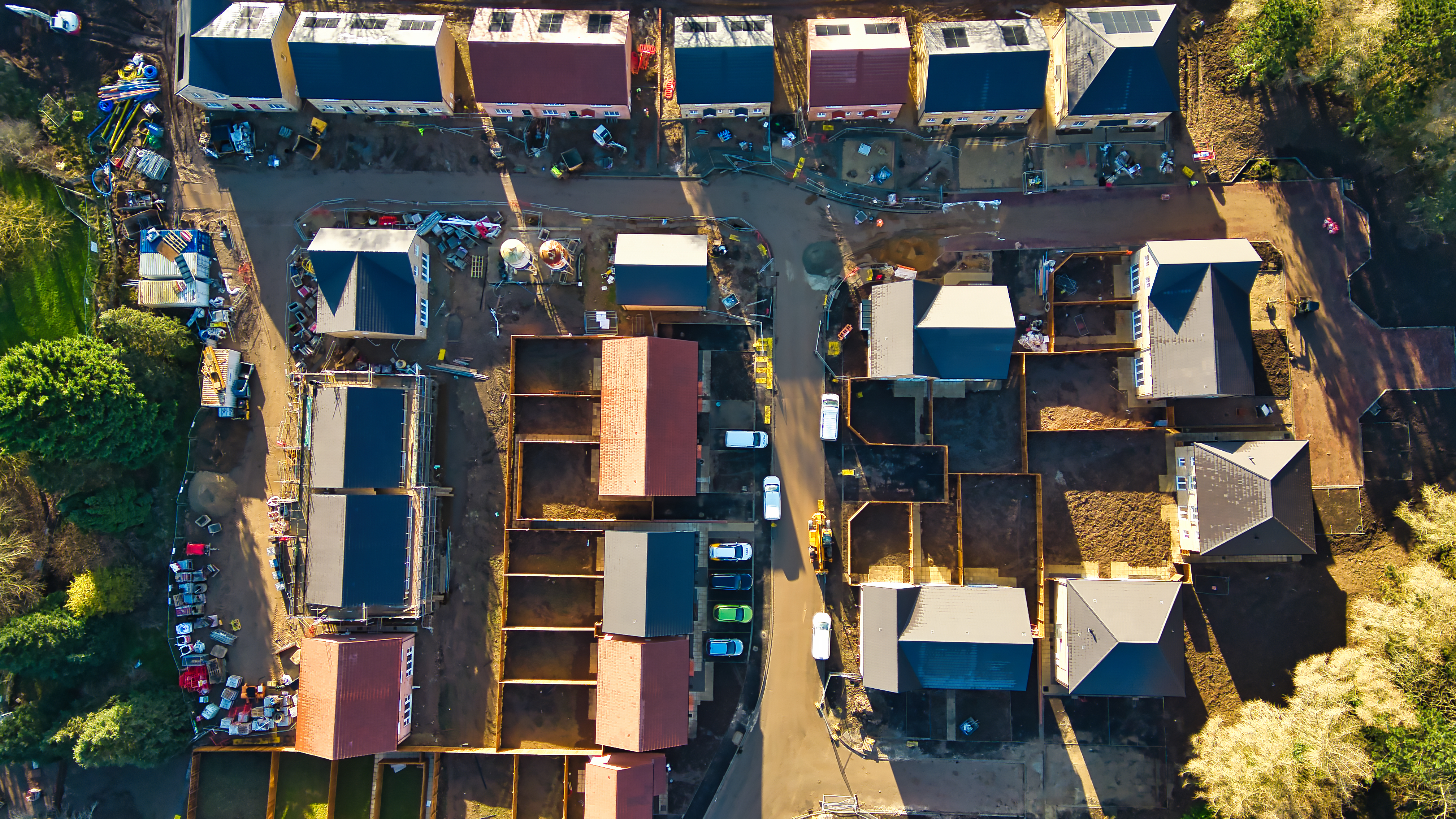 Aerial view of a residential construction site. Numerous houses in various stages of completion, surrounded by earthworks, vehicles, and construction equipment in Knaresborough, UK.