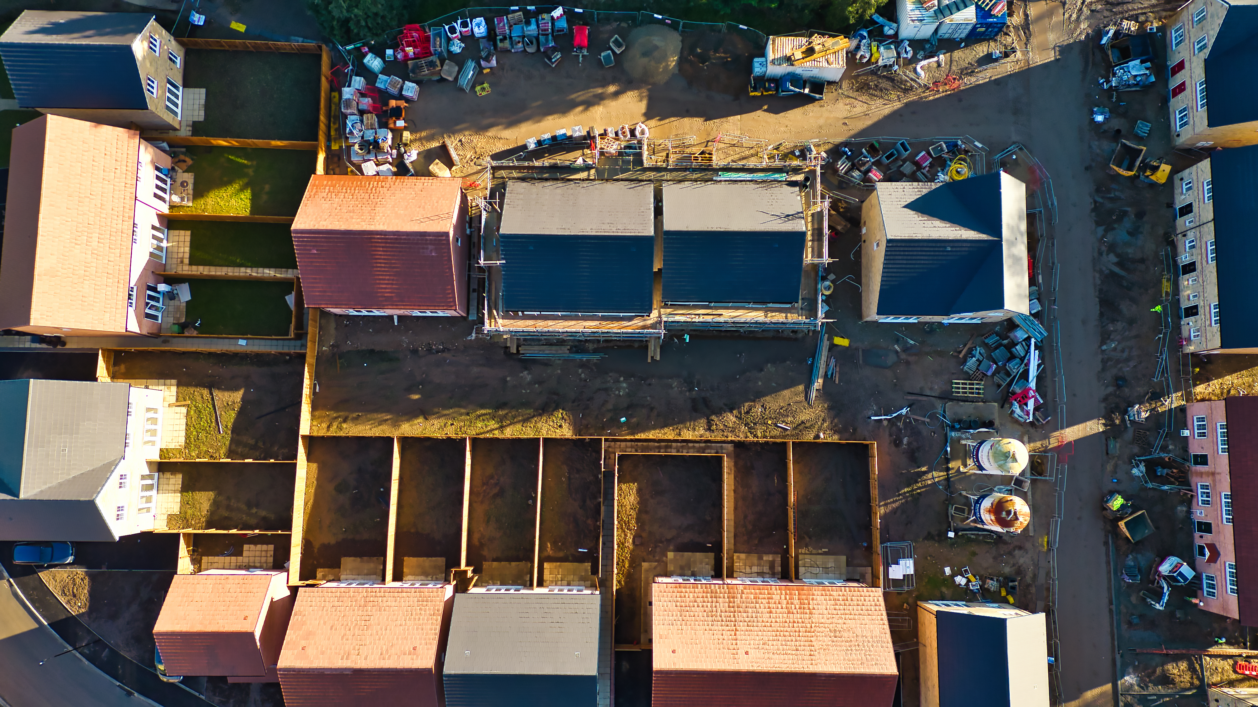 Aerial view of a residential construction site. Newly built homes and houses under construction are visible, along with earthworks, scaffolding, and construction equipment in Knaresborough, UK.