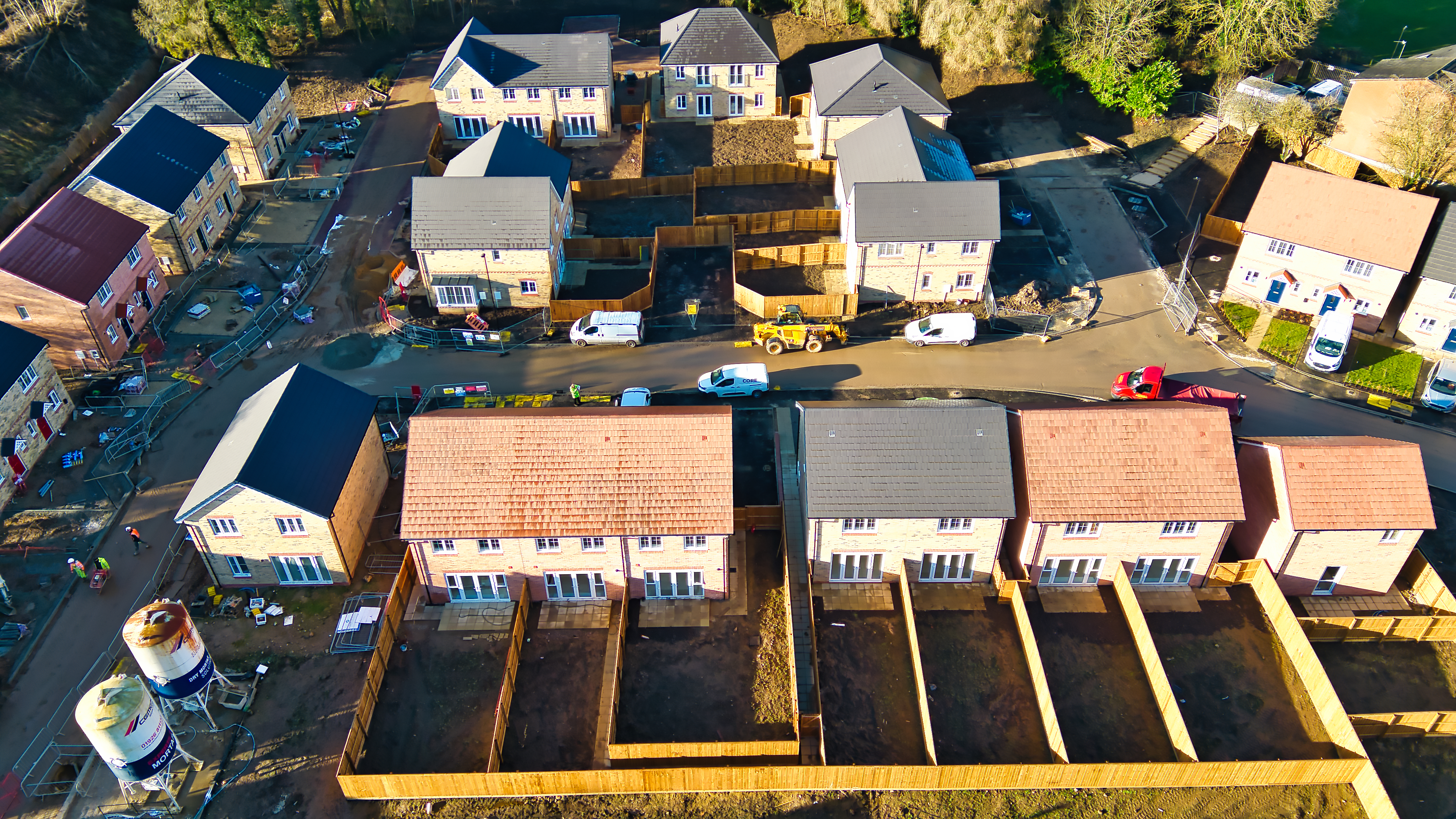 Aerial view of a new housing development. Rows of two-story houses under construction, with several vehicles and construction equipment present. Wooden fences surround individual properties in Knaresborough, UK.