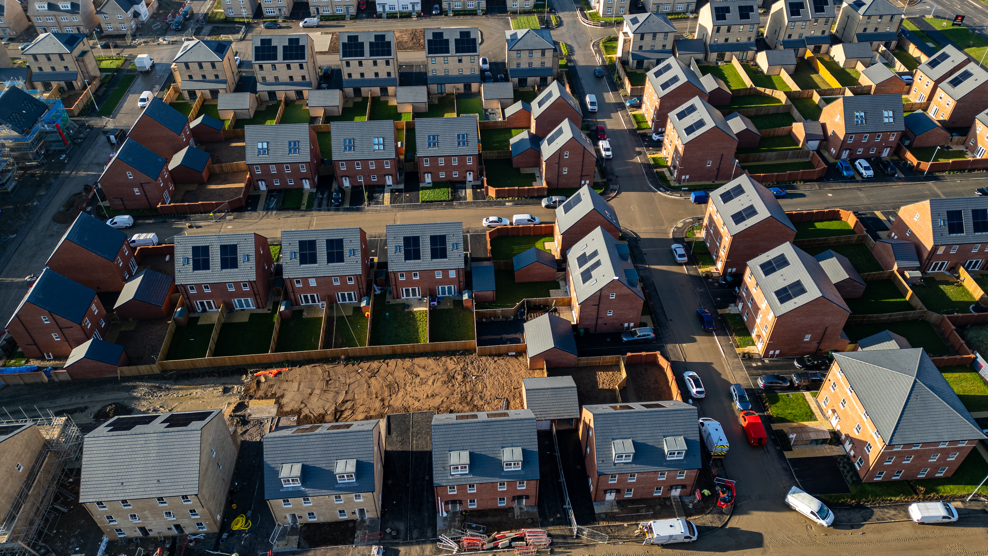Aerial view of a new housing development featuring red brick houses with grey roofs, some equipped with solar panels, surrounded by green lawns and fences at Desire by Strata Homes in Leeds, UK.