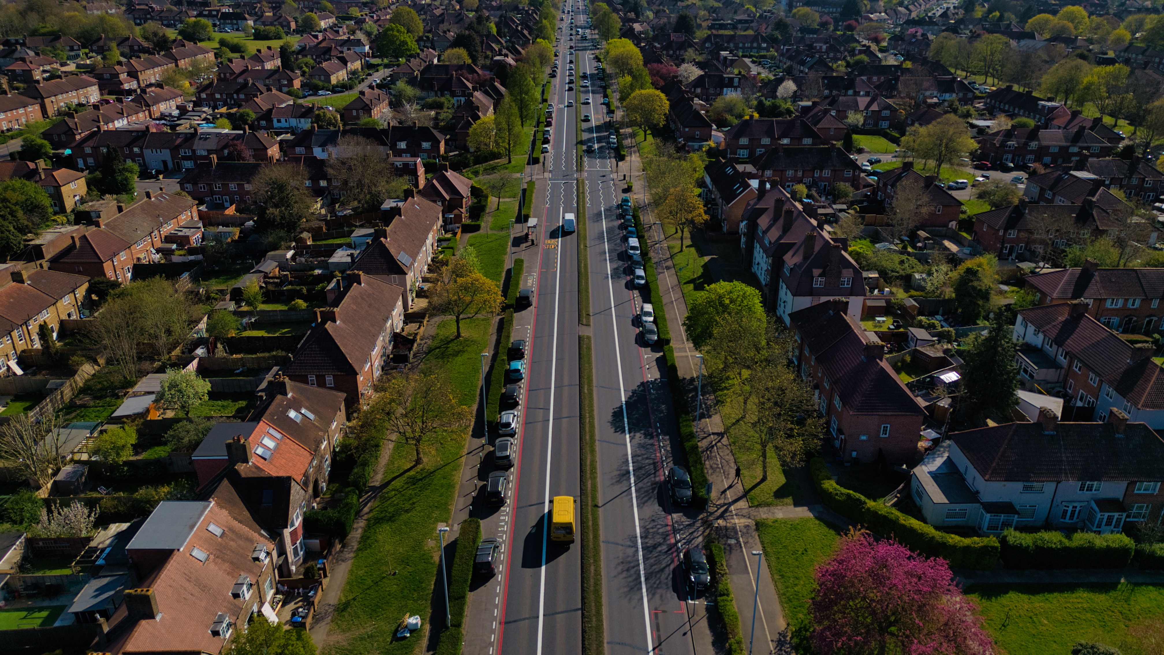 Aerial shot of a residential street lined with houses, cars, and trees. A multi-lane road runs through the center.