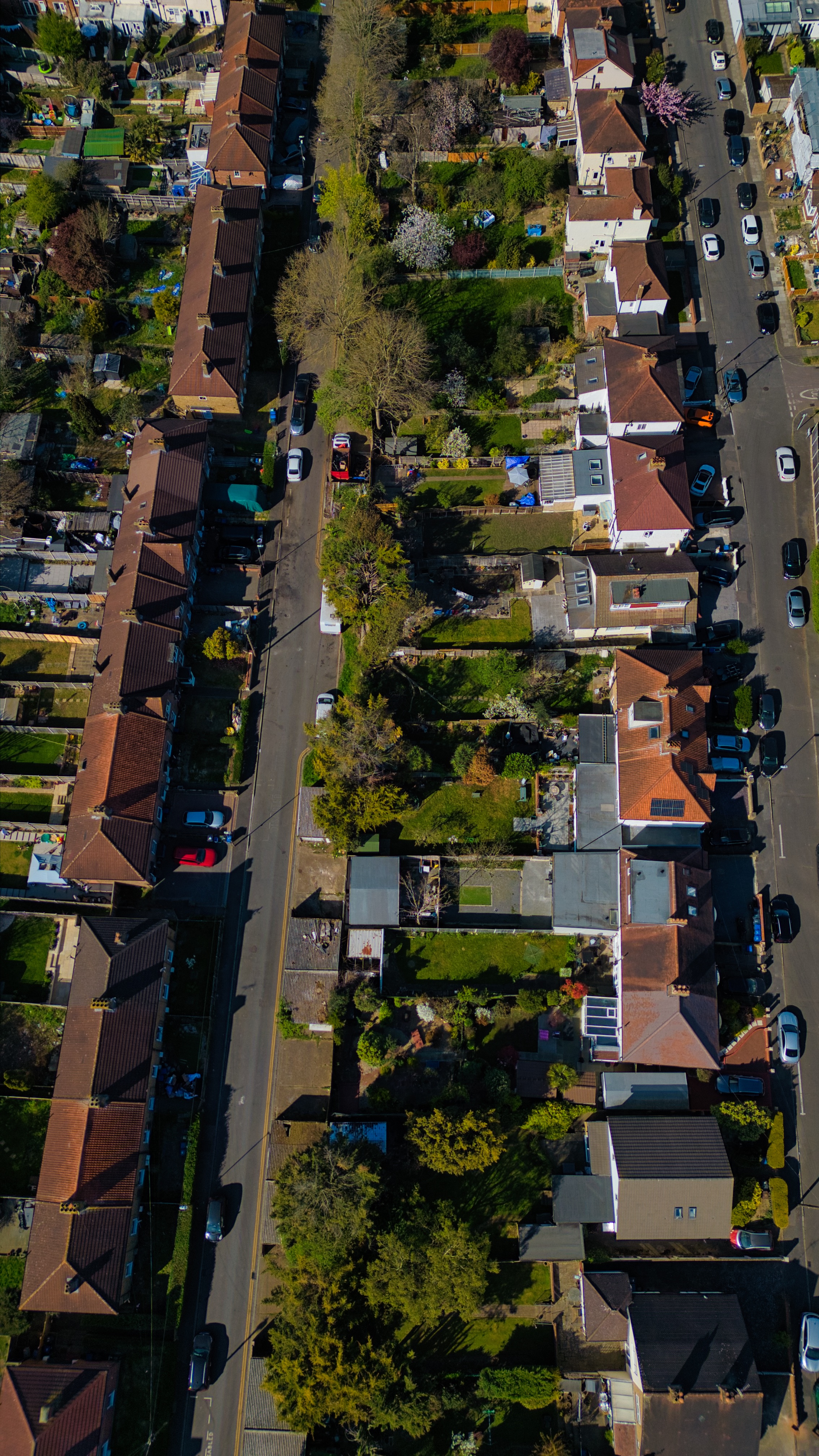 Aerial view of a residential street lined with houses, trees, and parked cars on a sunny day in Morden, London, UK.