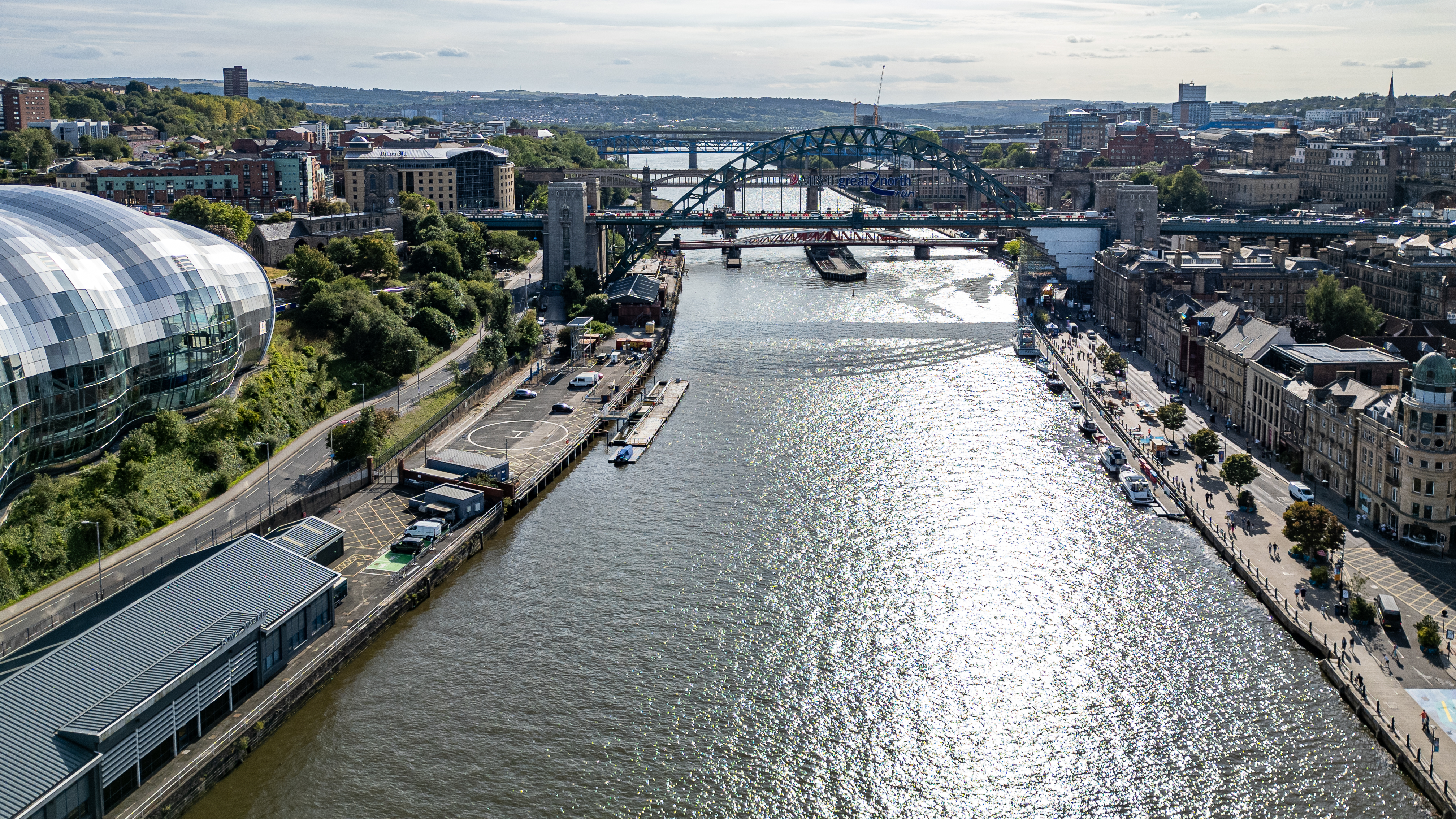 An aerial view of the River Tyne with bridges, buildings, and a modern glass structure. Sunlight glints on the water in Newcastle upon Tyne, UK.