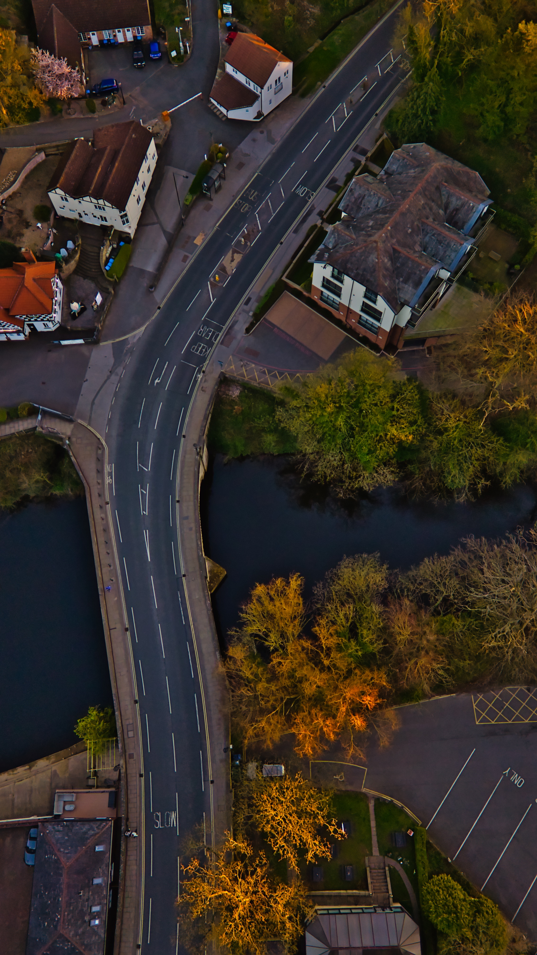 Aerial view of a road intersecting with a bridge over a river, surrounded by buildings, trees, and a parking lot in natural evening light in Knaresborough, UK.