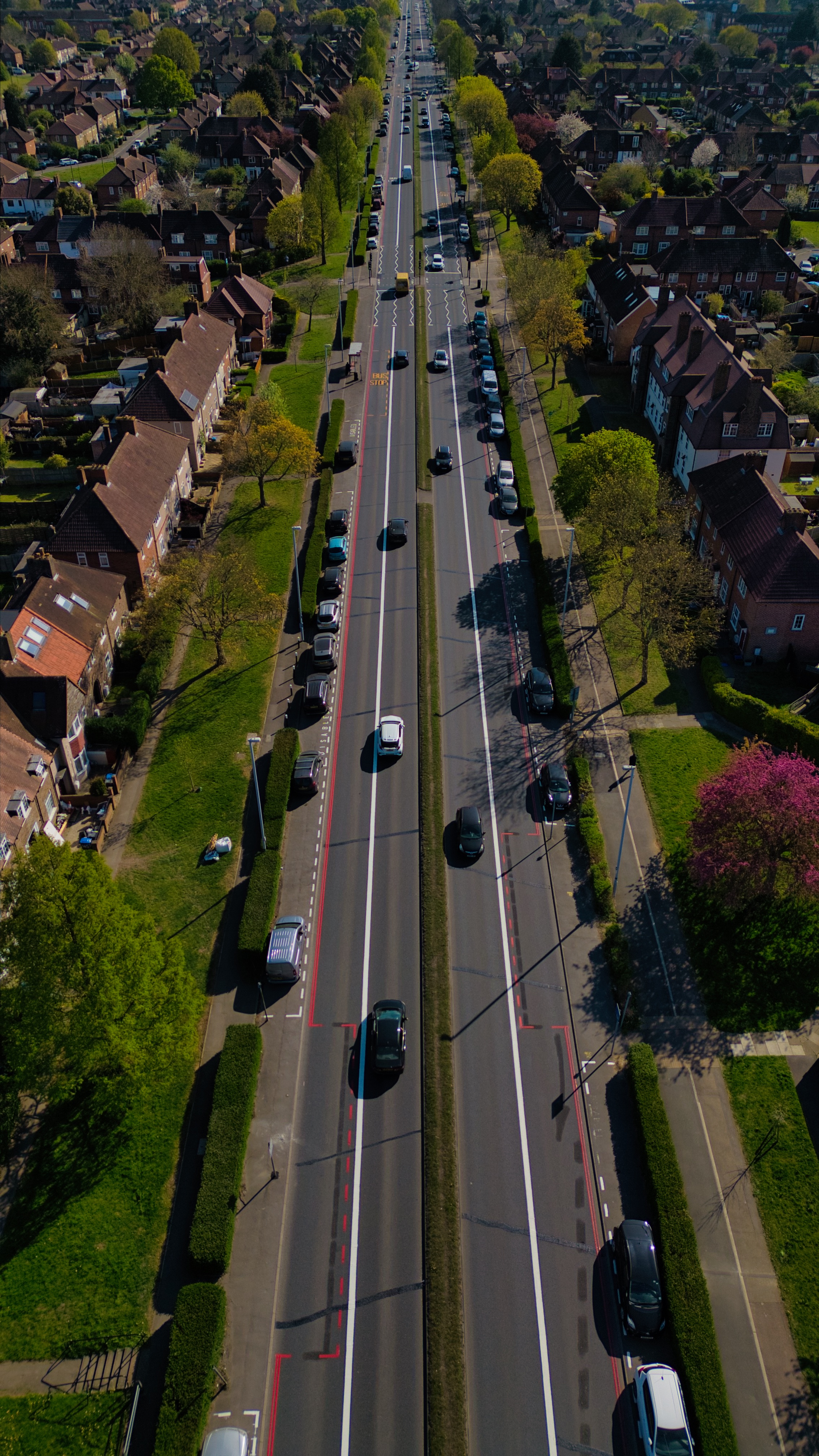 Aerial view of a straight road dividing residential area, lined with parked cars, trees, and houses on both sides in Morden, London, UK.