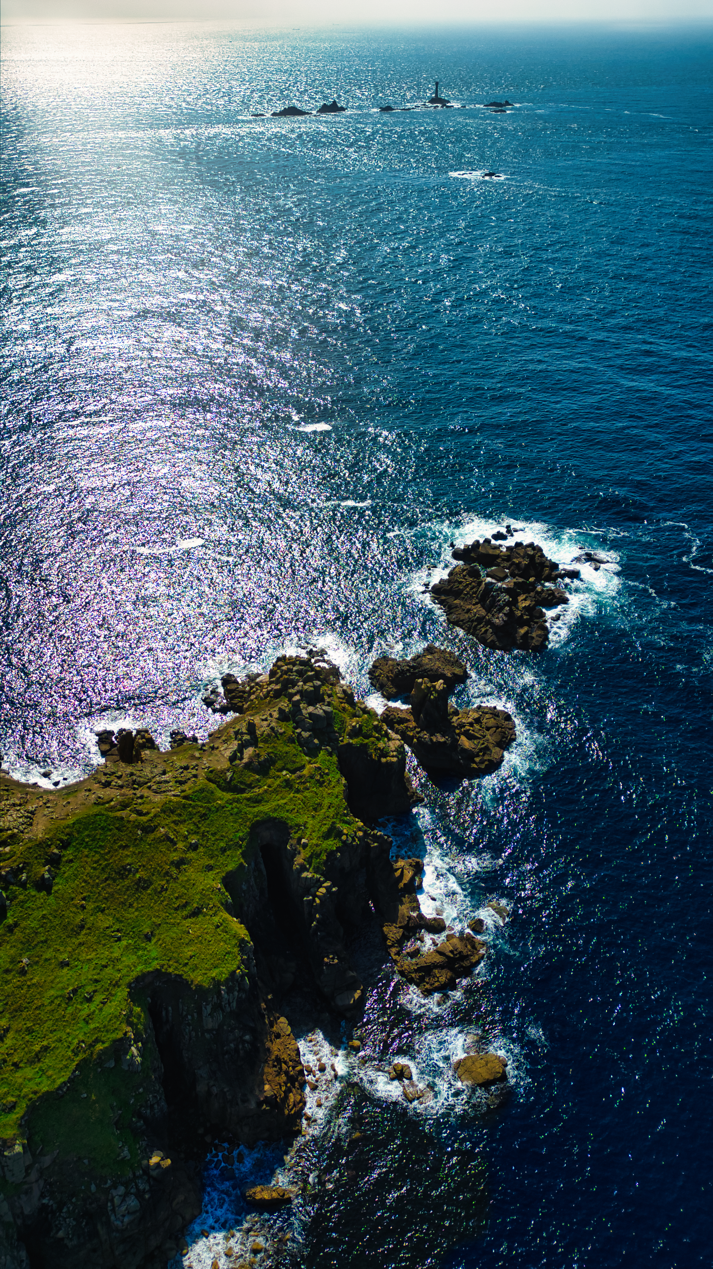 Aerial view of a rocky coastline with lush green vegetation, surrounded by deep blue ocean waters. The sunlight reflects off the water, creating a shimmering effect. In the distance, a lighthouse can be seen on a small island.