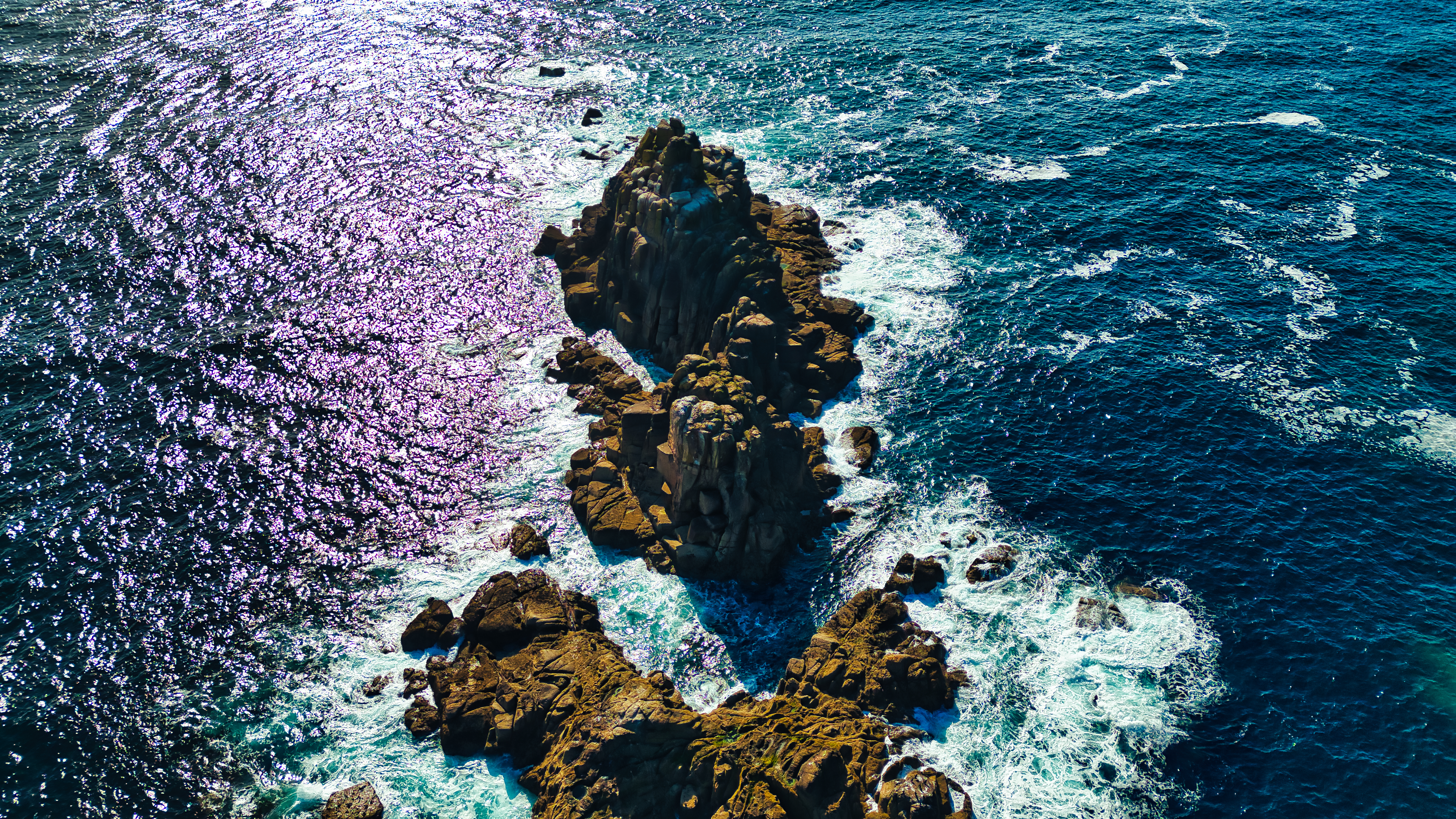 Aerial view of rocky formations surrounded by vibrant blue ocean waves. The sunlight reflects off the water, creating a shimmering effect. The rugged coastline features various textures and colors, highlighting the natural beauty of the seascape.