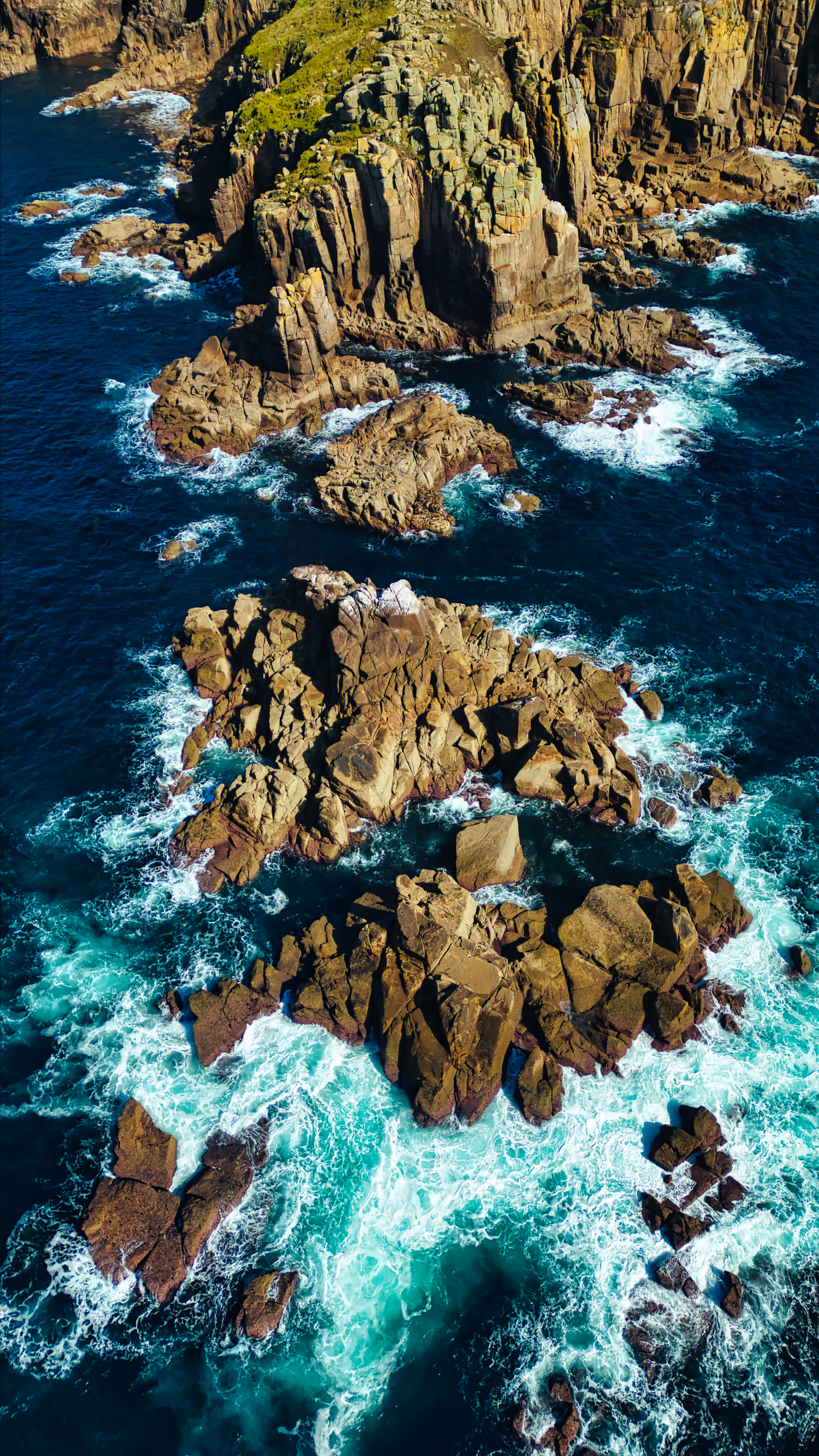 Aerial view of rocky coastline with waves crashing against the rocks. The scene features a mix of dark blue ocean water and rugged, textured rock formations, creating a dramatic natural landscape.