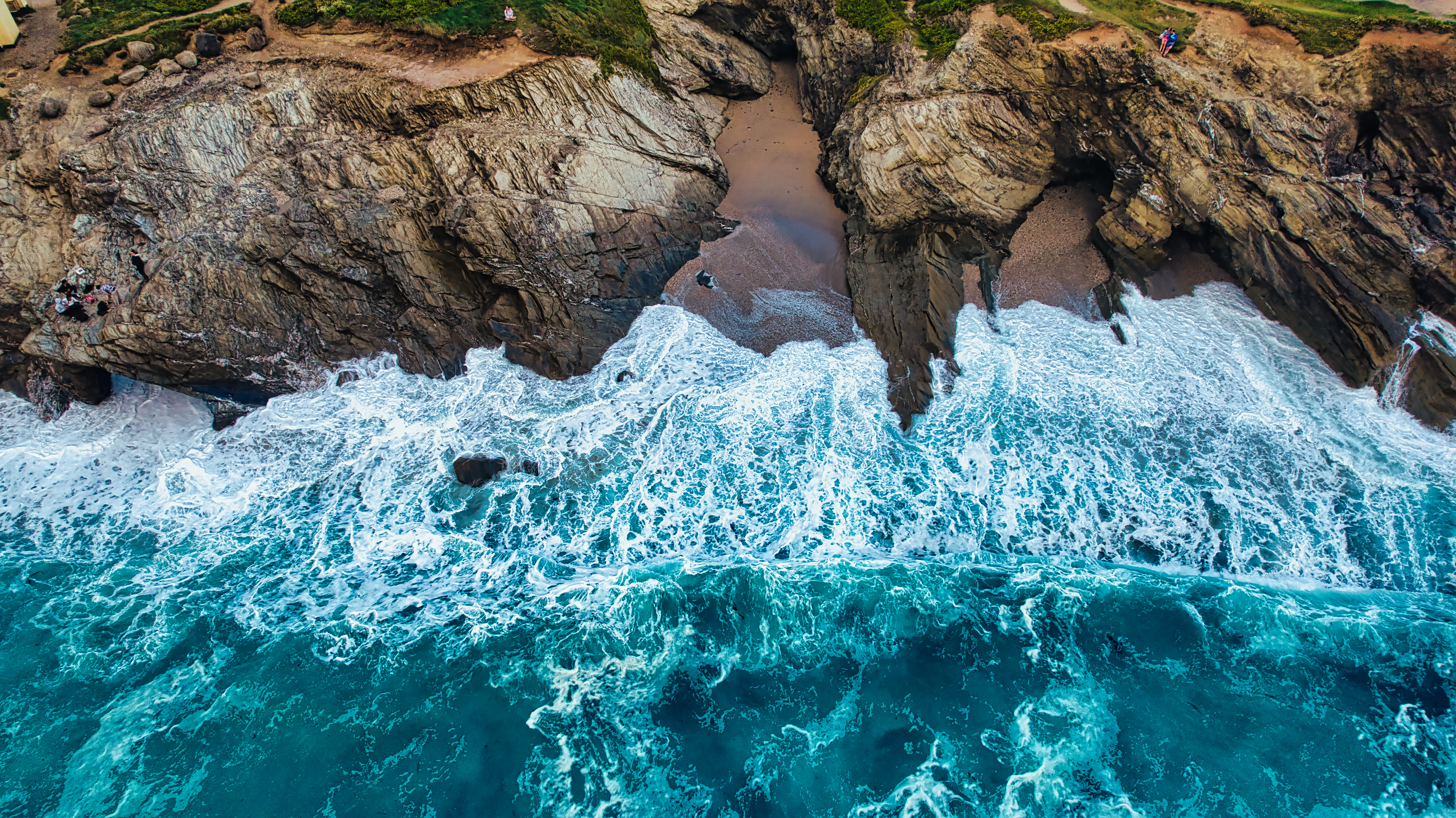 Aerial view of rocky coastline with crashing waves. The ocean is vibrant blue, creating foam as it hits the shore. The landscape features rugged cliffs and sandy beach areas, showcasing the natural beauty of the seaside.