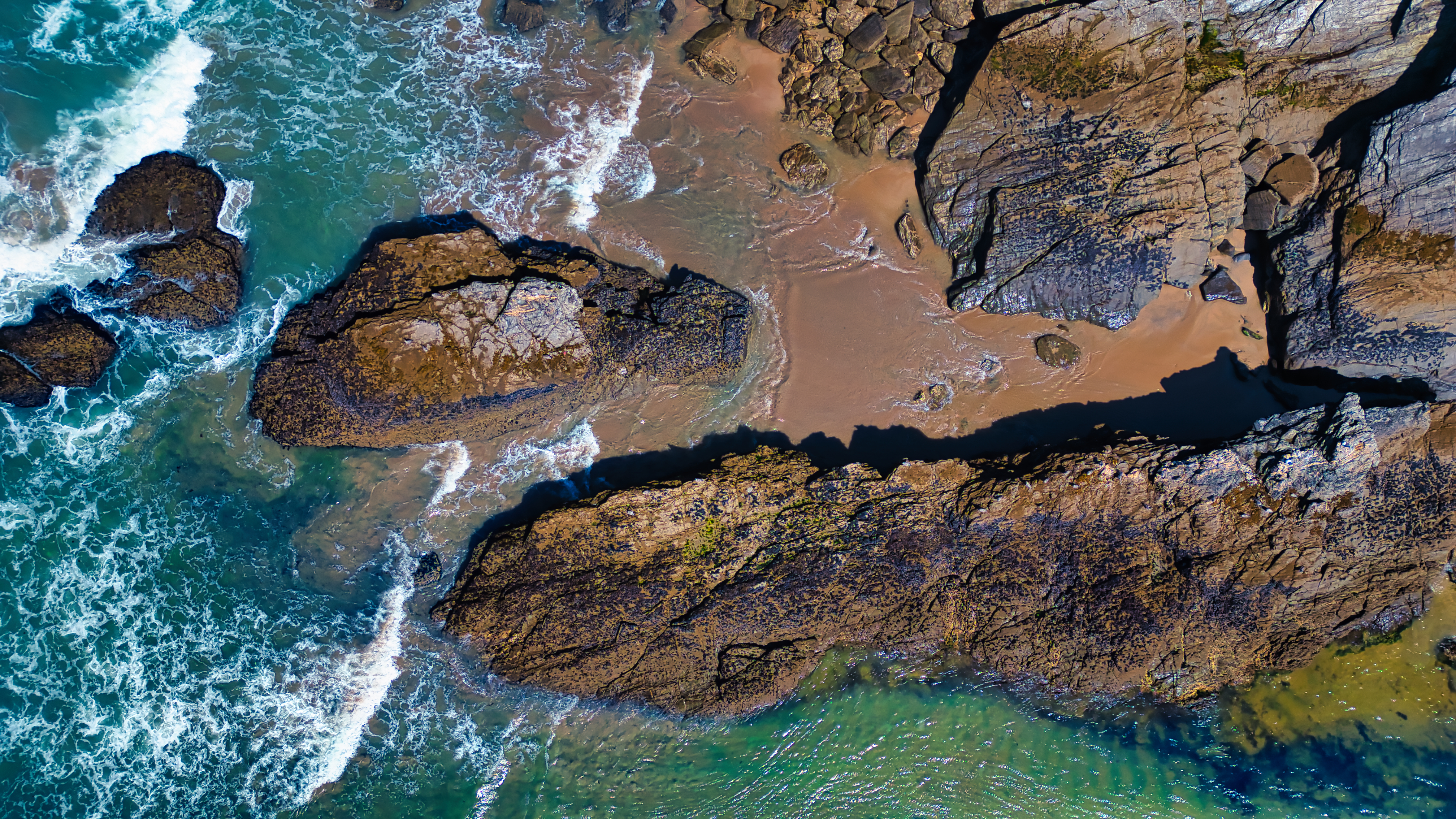 Aerial view of rocky coastline with waves crashing against the rocks. The sandy beach is visible between the rocks, showcasing a mix of textures and colors from the water and land.