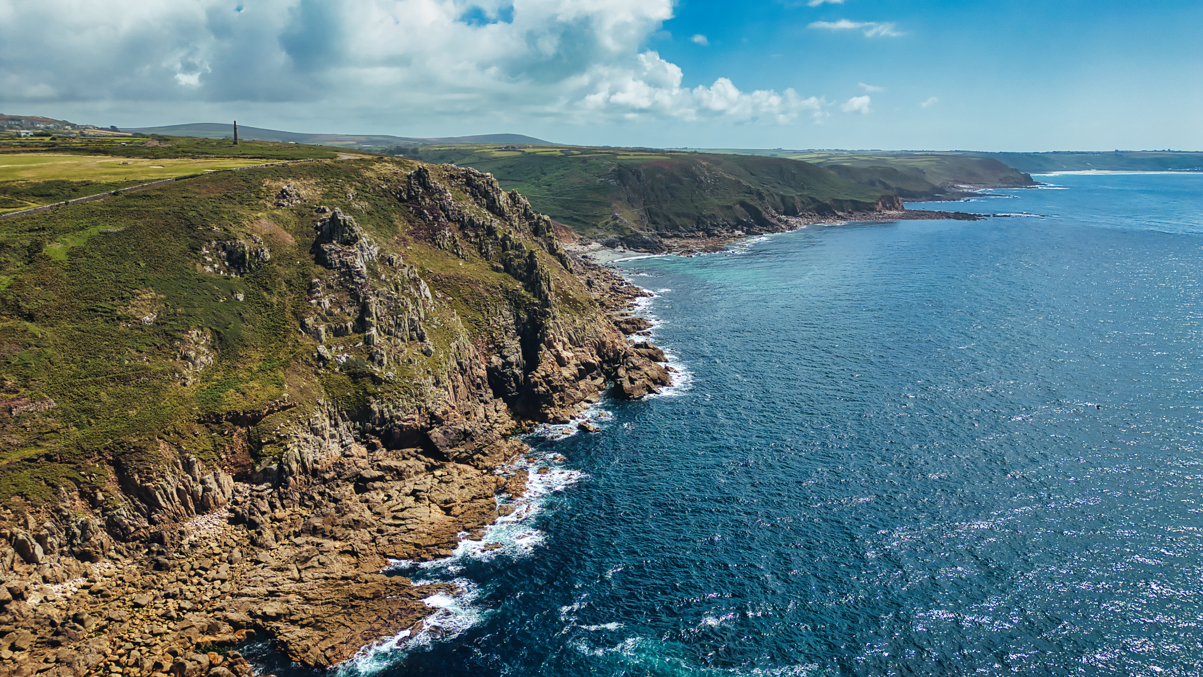 A stunning aerial view of rugged cliffs along a coastline, with clear blue waters and a bright sky. The landscape features green hills and rocky shorelines, showcasing the natural beauty of the area.