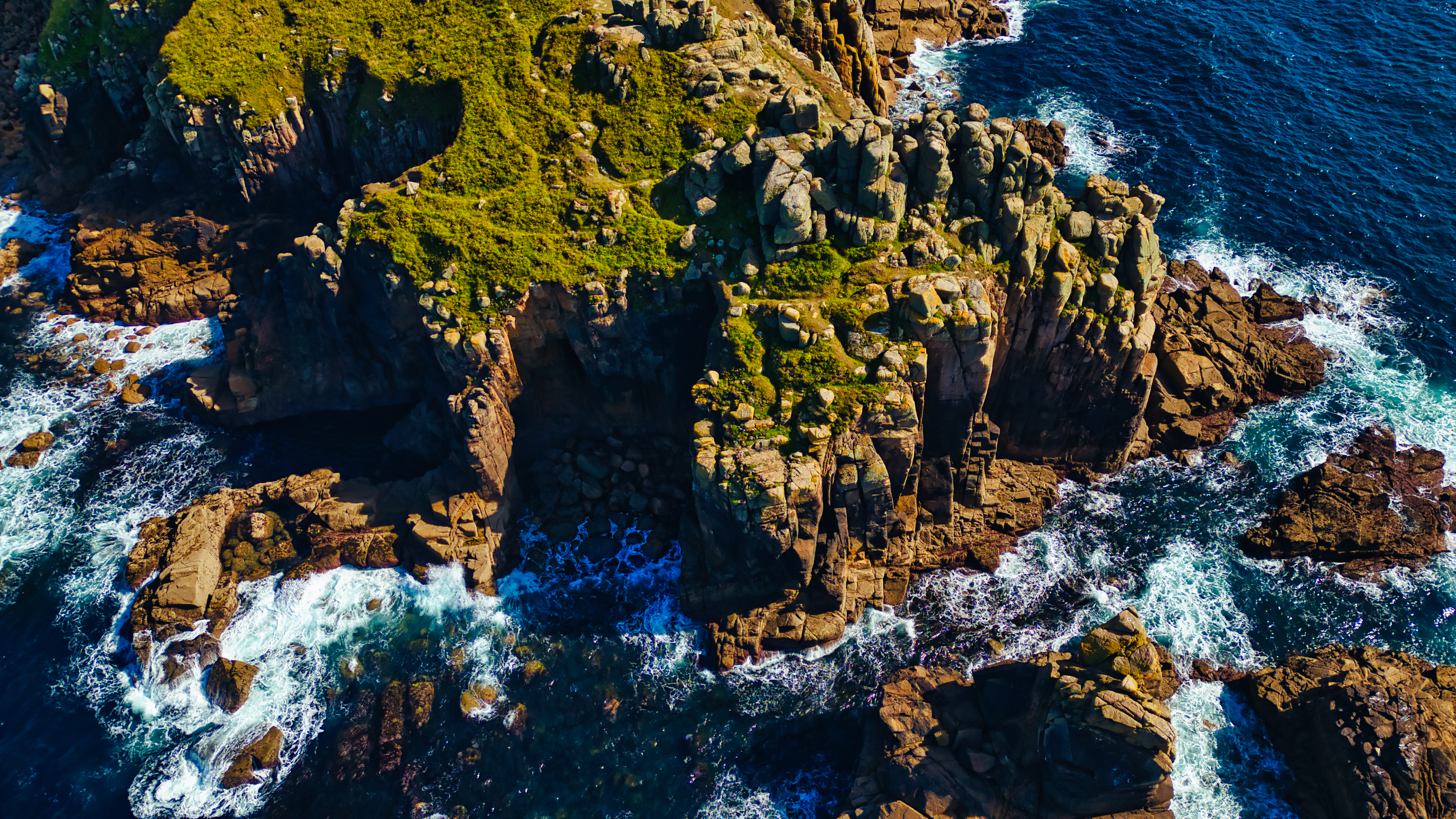 Aerial view of rugged coastal cliffs surrounded by deep blue ocean waves. The rocky formations are covered with green vegetation, creating a striking contrast against the water. The scene captures the beauty of nature and the power of the sea.