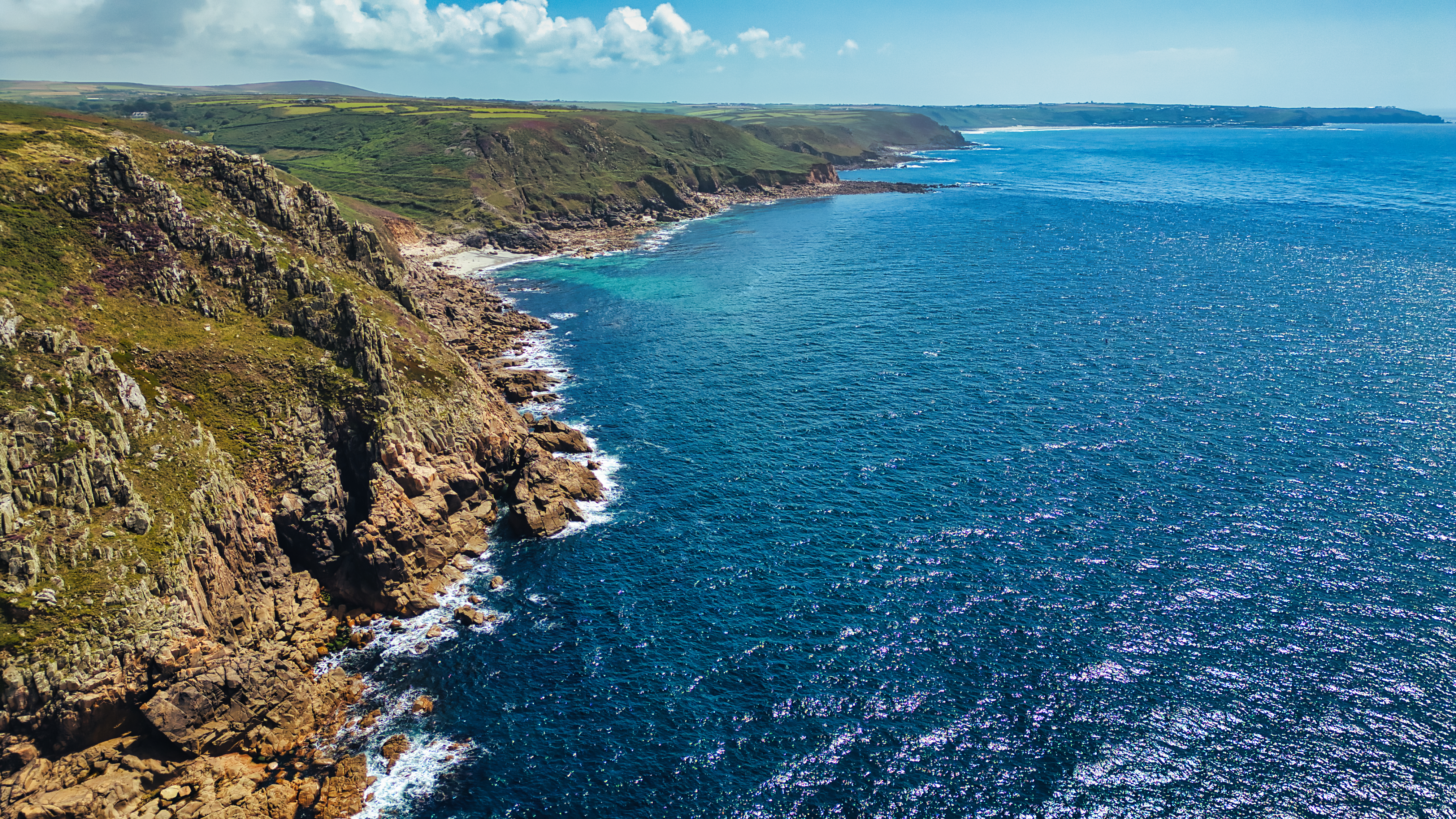 Aerial view of a rugged coastline with cliffs and clear blue waters. The landscape features green hills in the background, rocky shores, and a serene ocean. The sky is partly cloudy, enhancing the natural beauty of the scene.