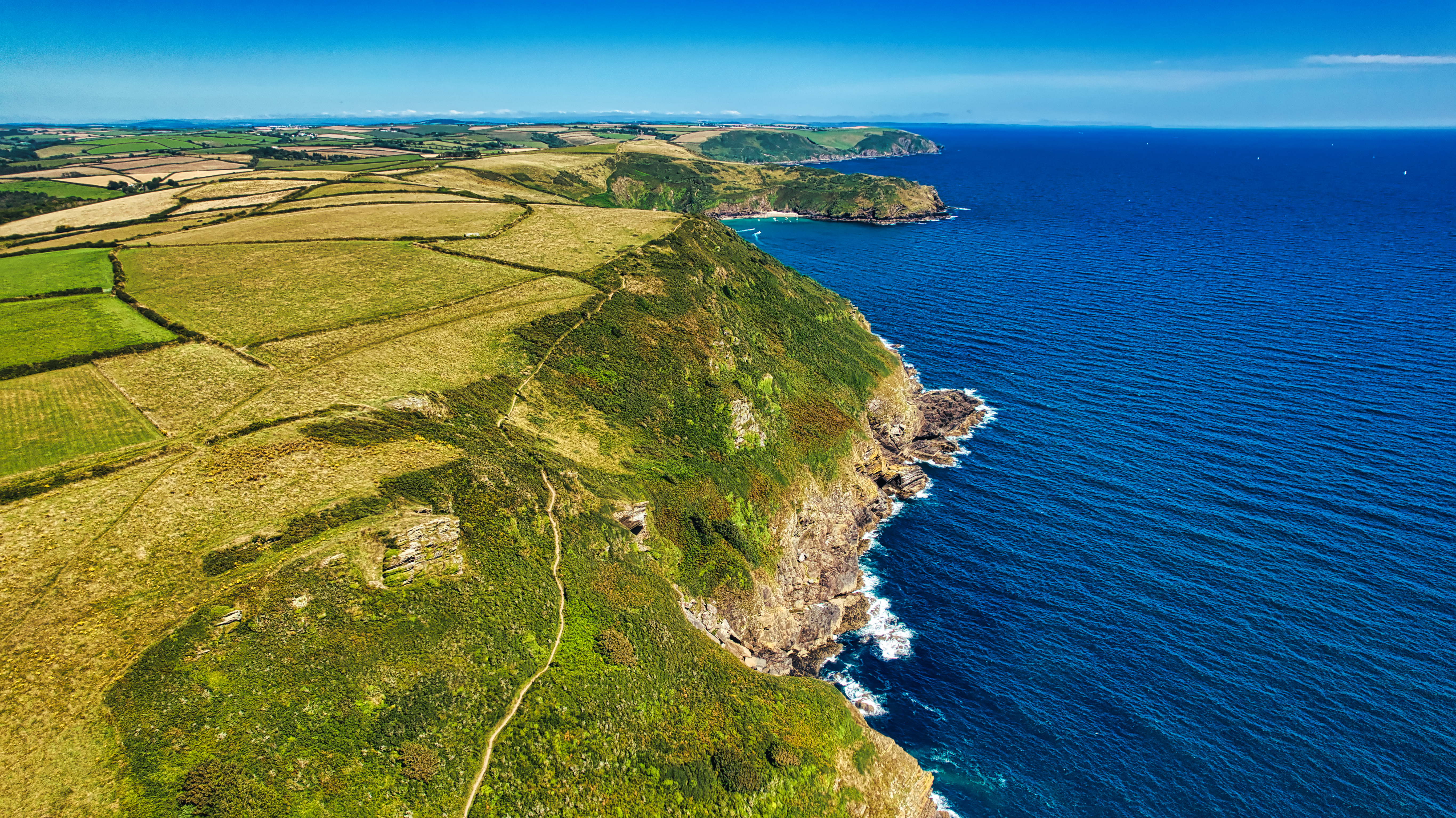 Aerial view of a rugged coastline with lush green fields and cliffs meeting the blue ocean. The landscape features a mix of agricultural land and natural scenery, showcasing the beauty of the coastline under a clear blue sky.