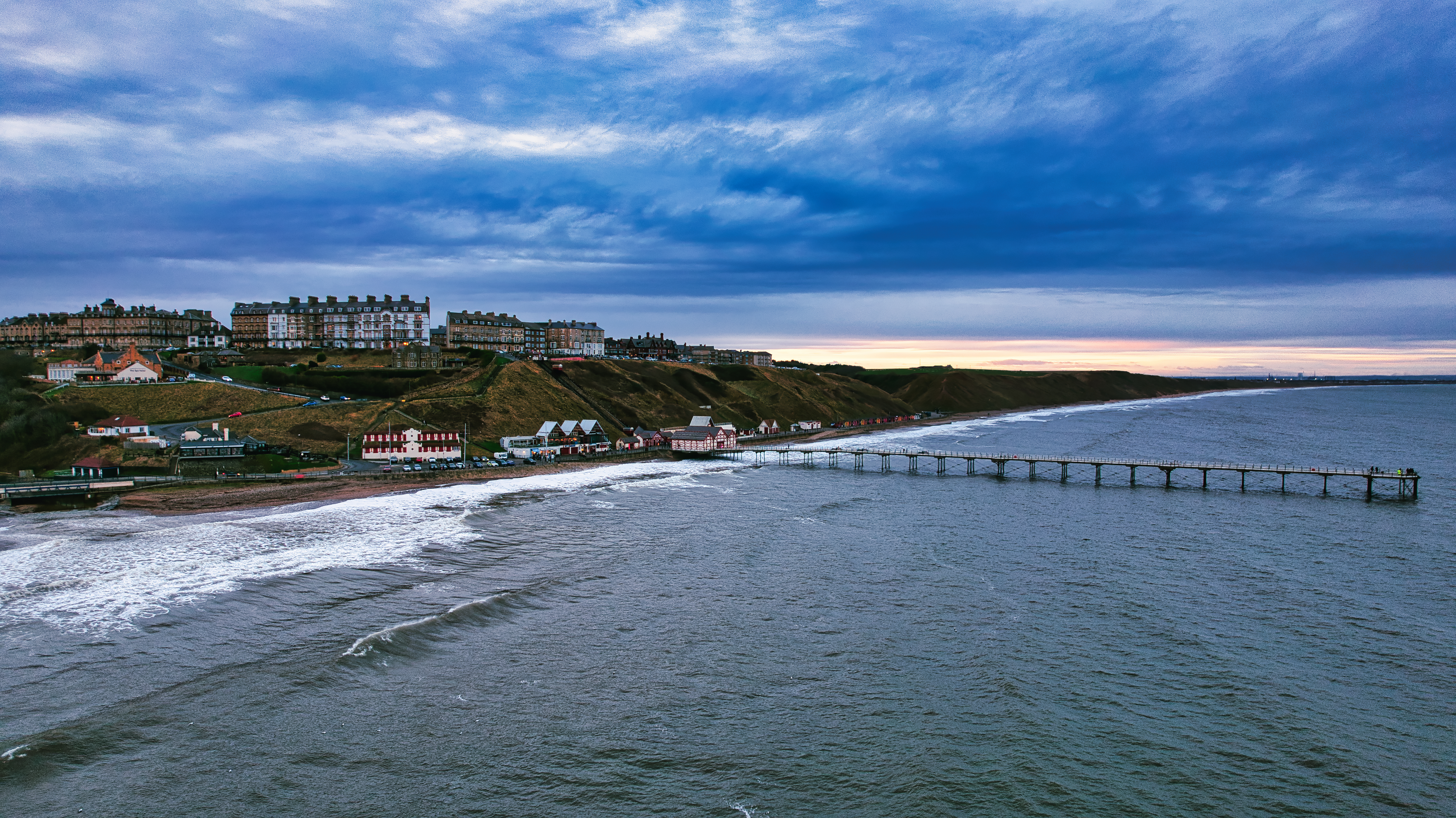 Coastal scene featuring a long pier extending from a beach with buildings and a cliff. The sky displays a mix of blue and cloudy tones, suggesting either dawn or dusk. Waves are visible near the shore in Saltburn by the Sea
