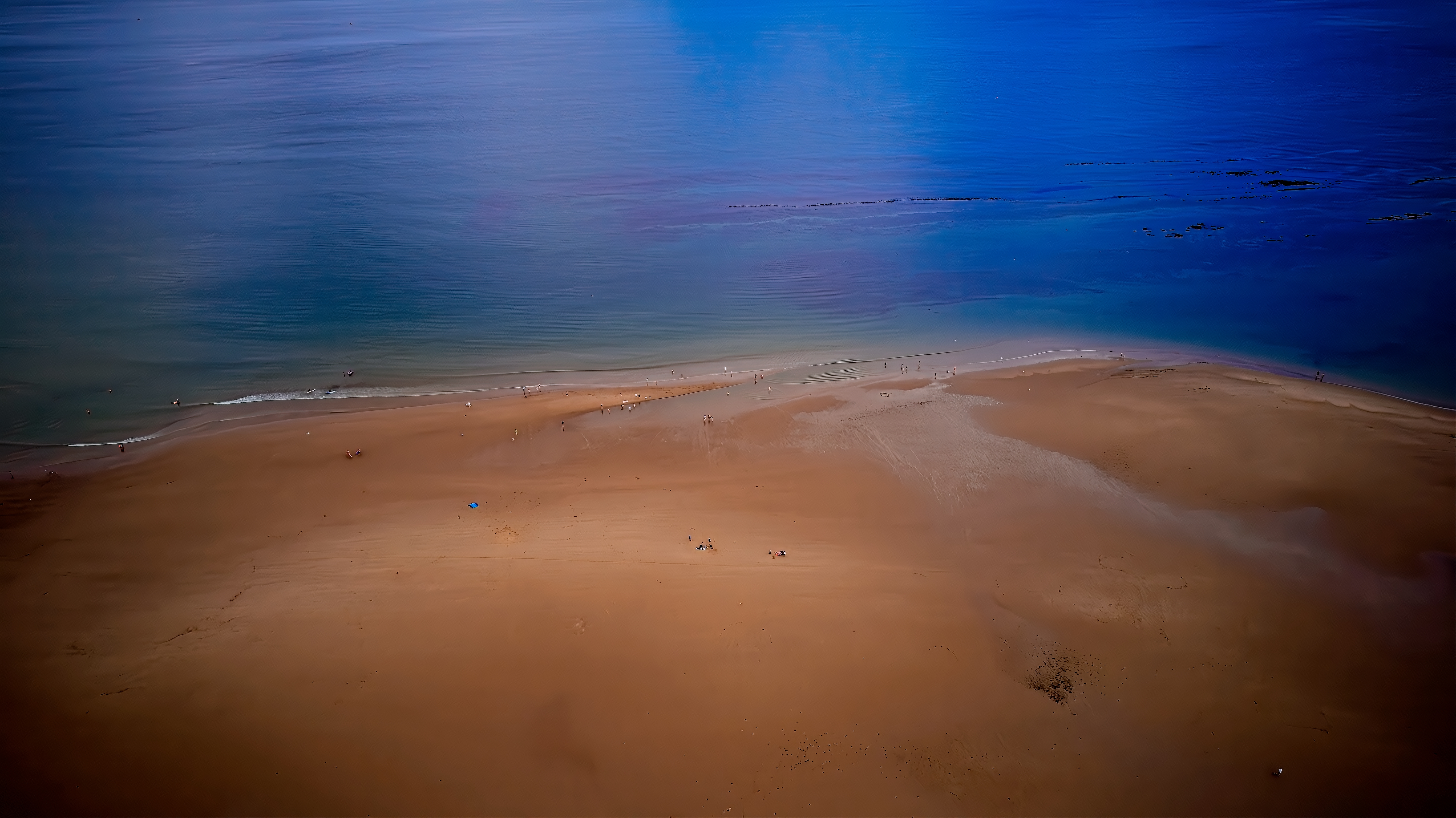 Aerial view of a serene beach with calm blue waters and a few people scattered along the shore.