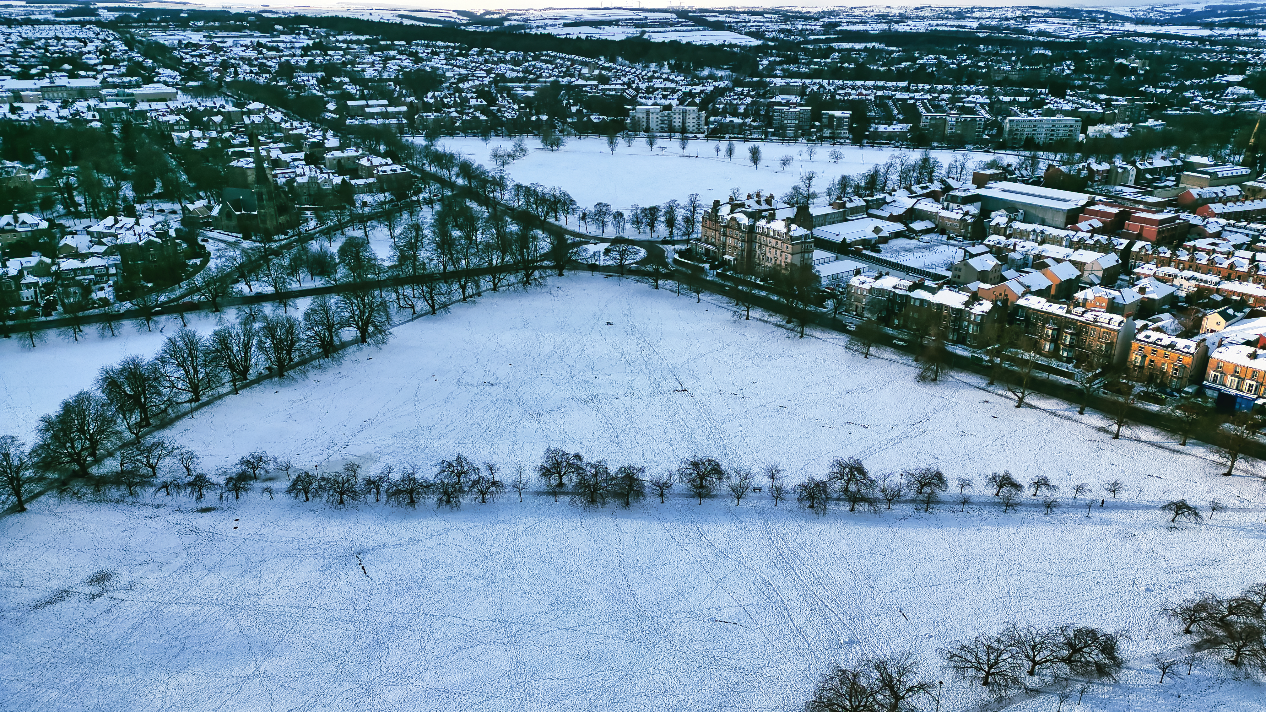 Aerial view of a snow-covered park bordered by residential buildings and trees. The park shows footprints in the snow. The buildings are primarily two-story structures with snow-covered roofs in Harrogate, UK.
