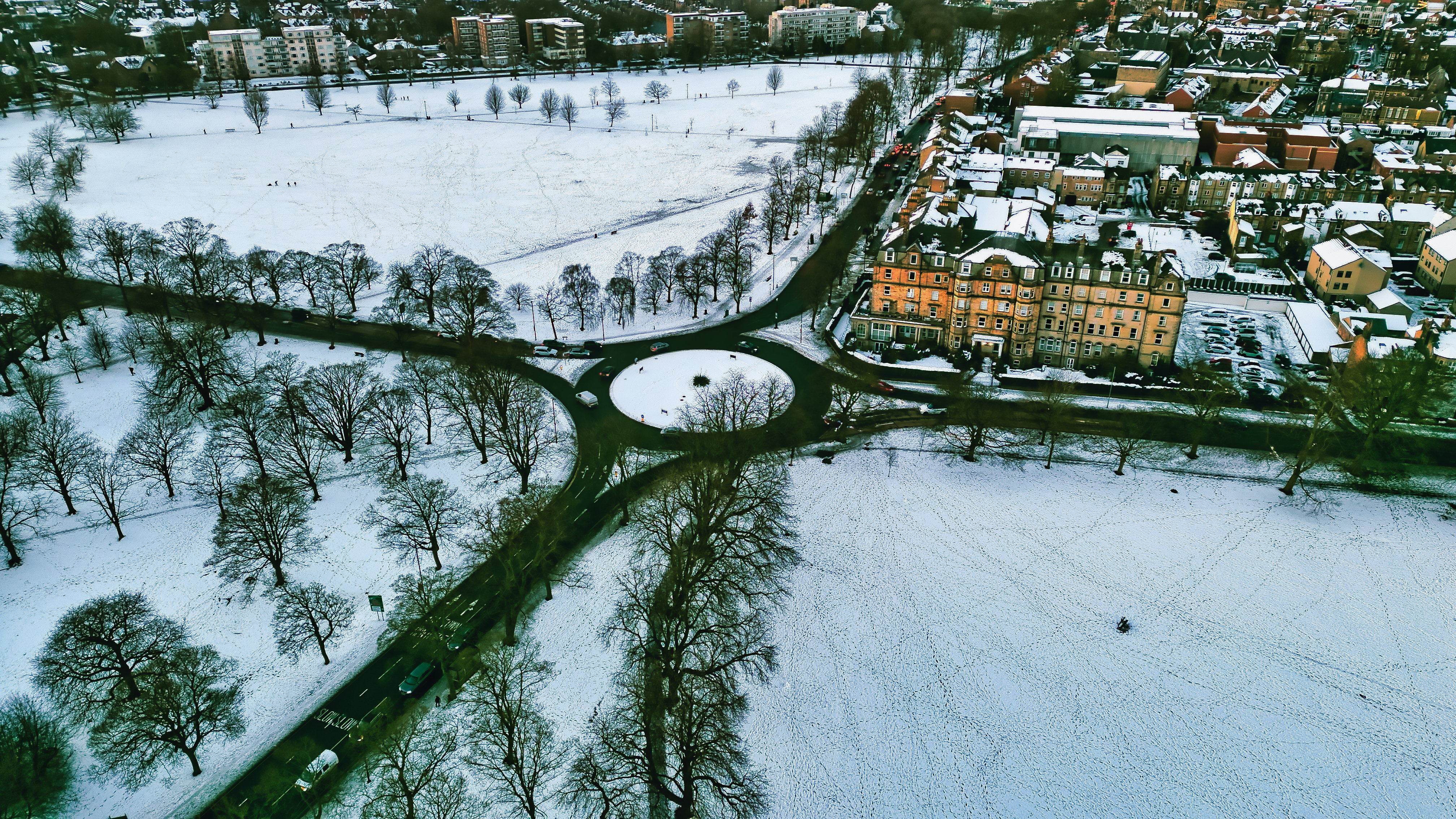 Aerial view of a snow-covered park with a roundabout and residential buildings. Trees line the park and roads, cars are visible on the roads. Buildings are mostly tan and brown in Harrogate, UK.