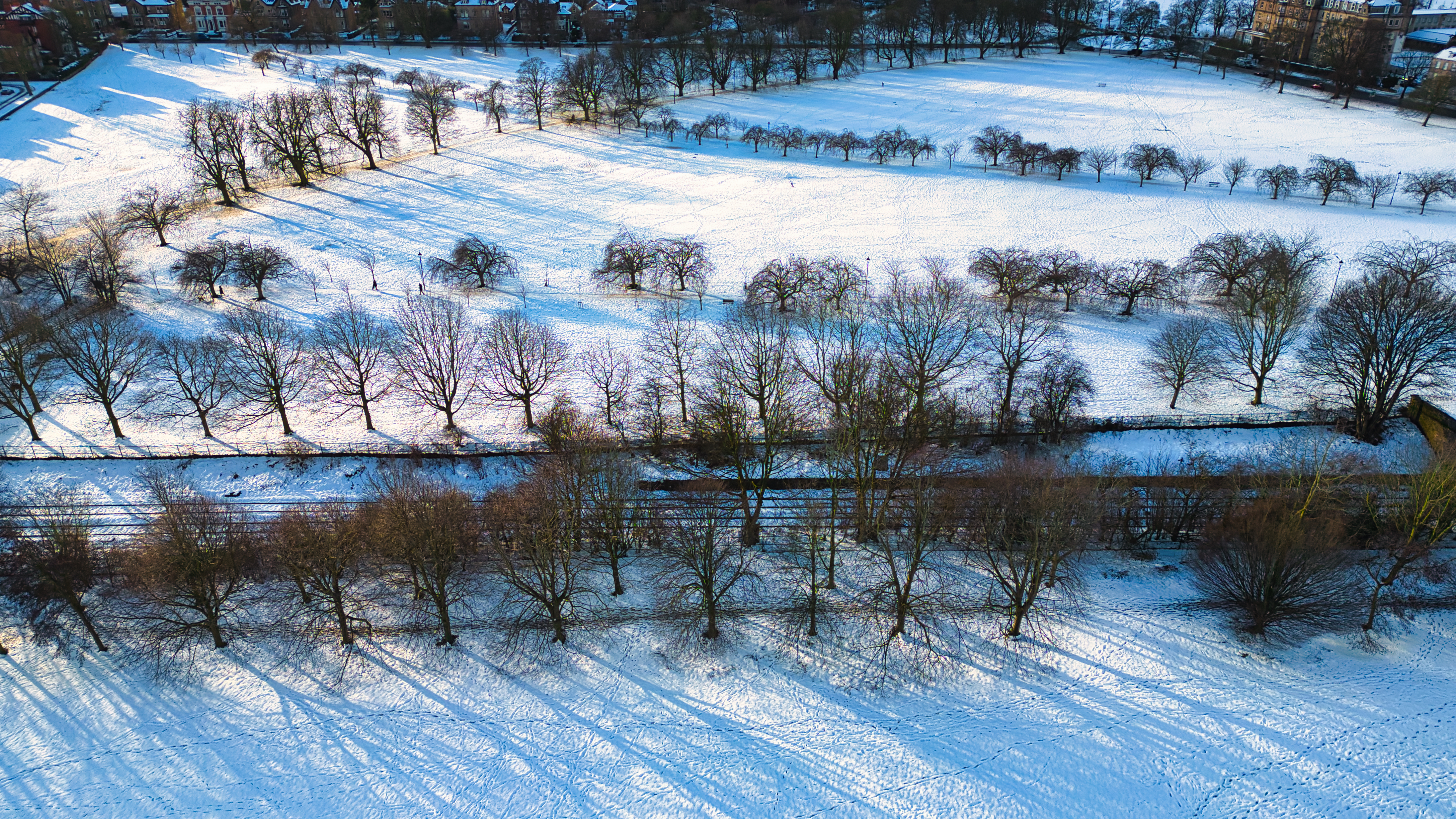 Aerial view of a snow-covered park with rows of leafless trees. A railway line is visible, separating the park into upper and lower sections. Long shadows cast by the trees are prominent on the snow in Harrogate, UK.