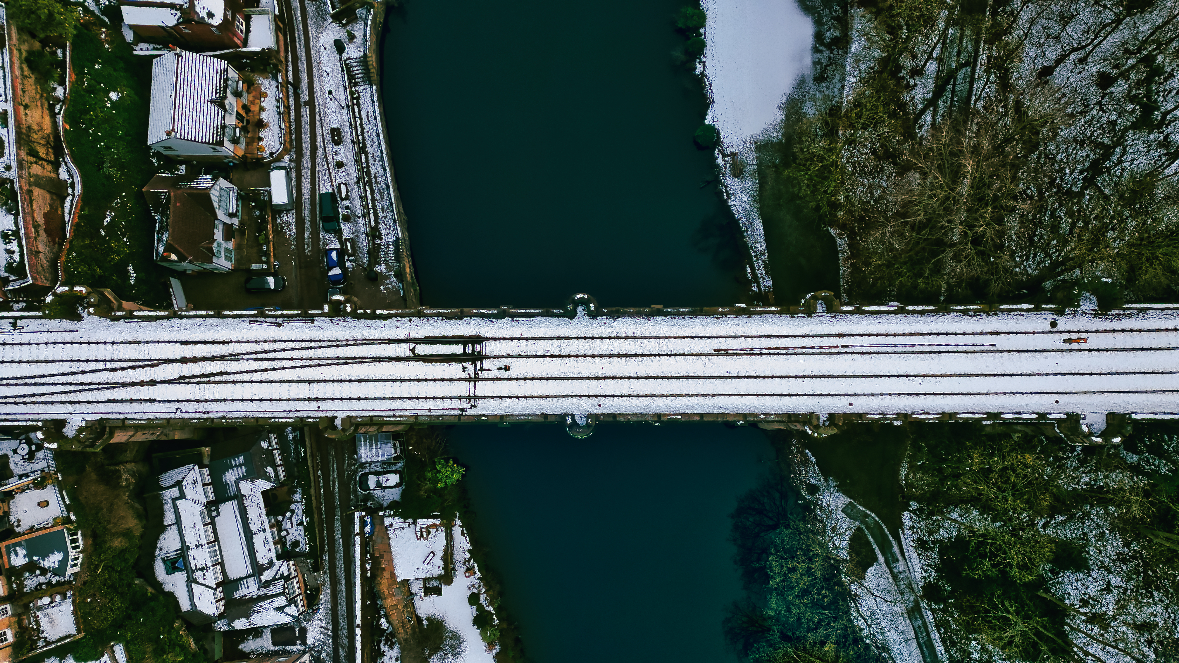 Aerial view of a snow-covered railway bridge spanning a river, with residential buildings and greenery visible on either side. The image is composed symmetrically, with the river and buildings mirroring each other in Knaresborough, UK.