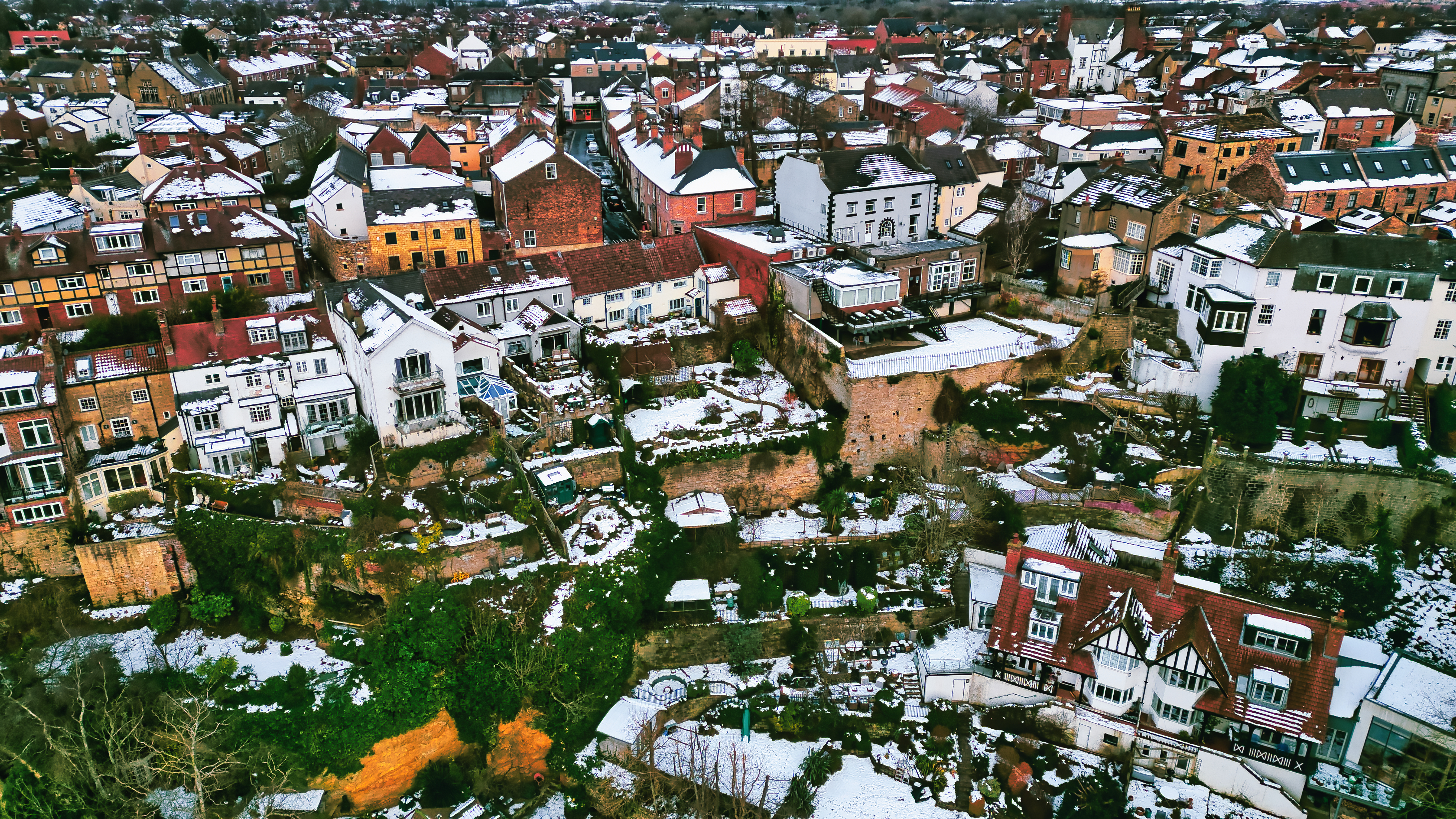 Aerial view of a snow-dusted town, showcasing a dense collection of residential buildings, gardens, and a retaining wall. Various architectural styles are visible, ranging from terraced houses to larger detached homes in Knaresborough, UK.