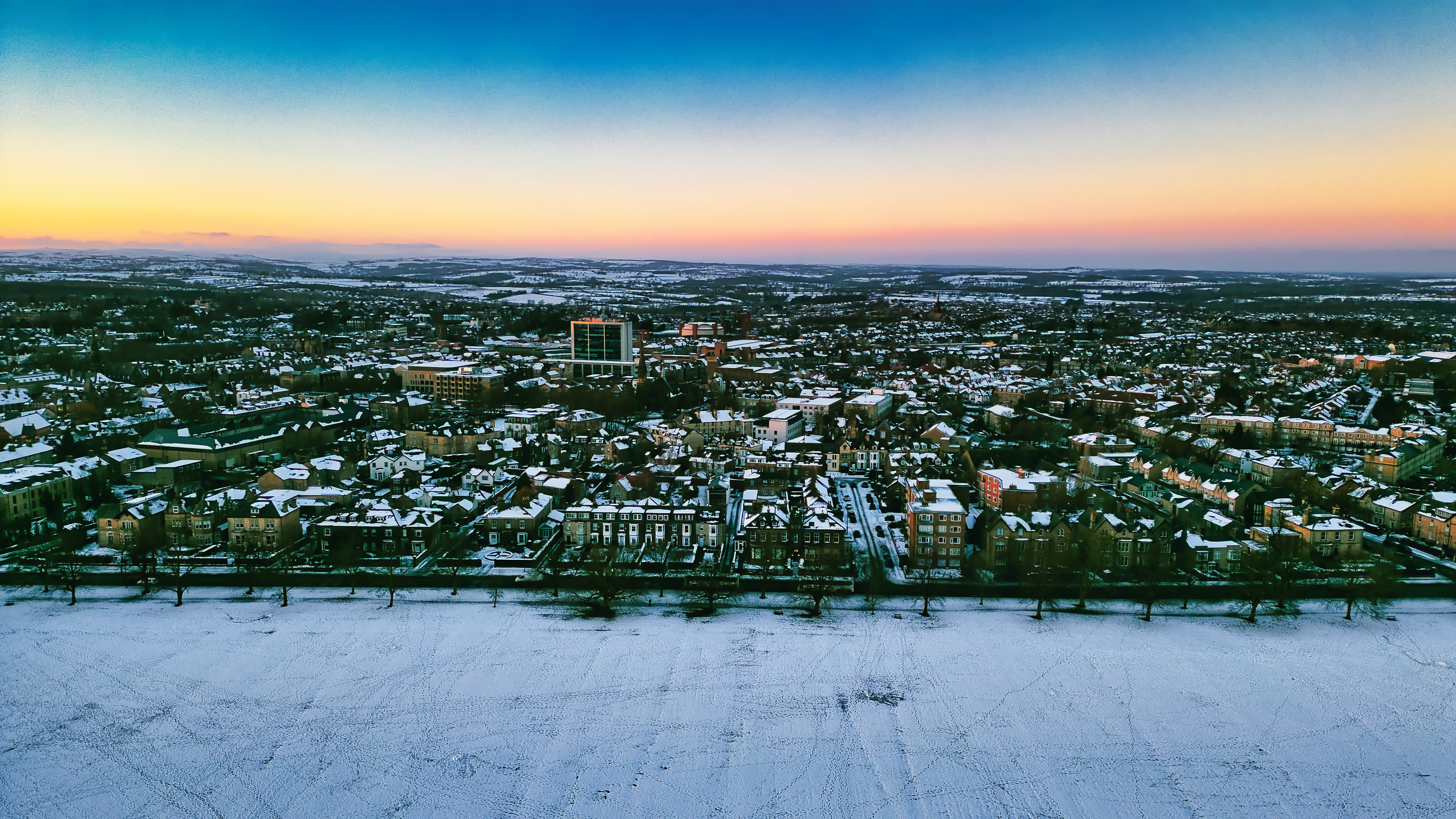 Aerial view of a snow-covered town at sunset. Rows of houses, trees, and a snow-covered field are visible. The sky displays a gradient of blue, orange, and pink hues in Harrogate, UK.