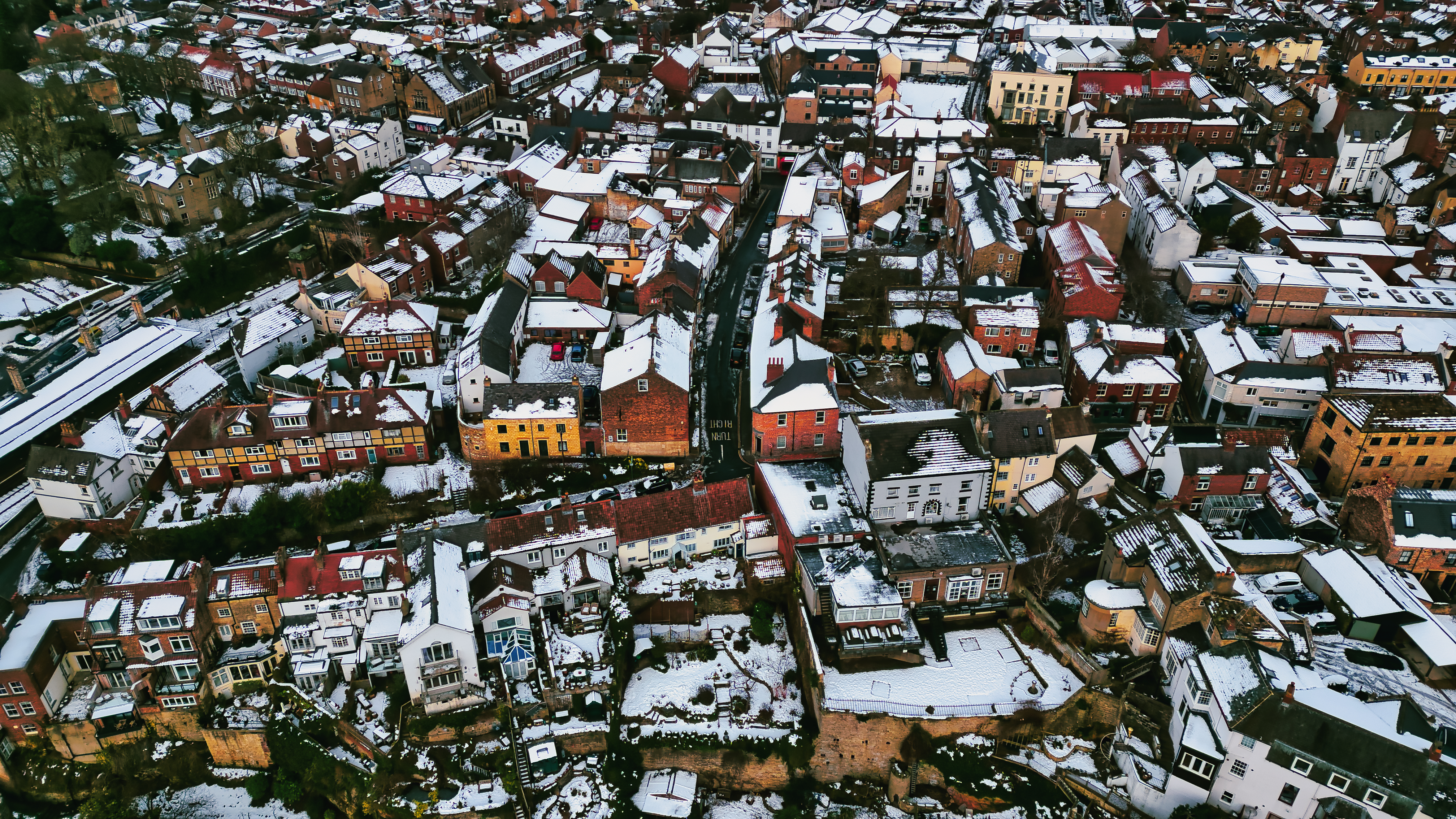 Aerial view of a snow-covered residential area, predominantly featuring two-story brick houses with pitched roofs. Narrow streets and small gardens are visible in Knaresborough, UK.
