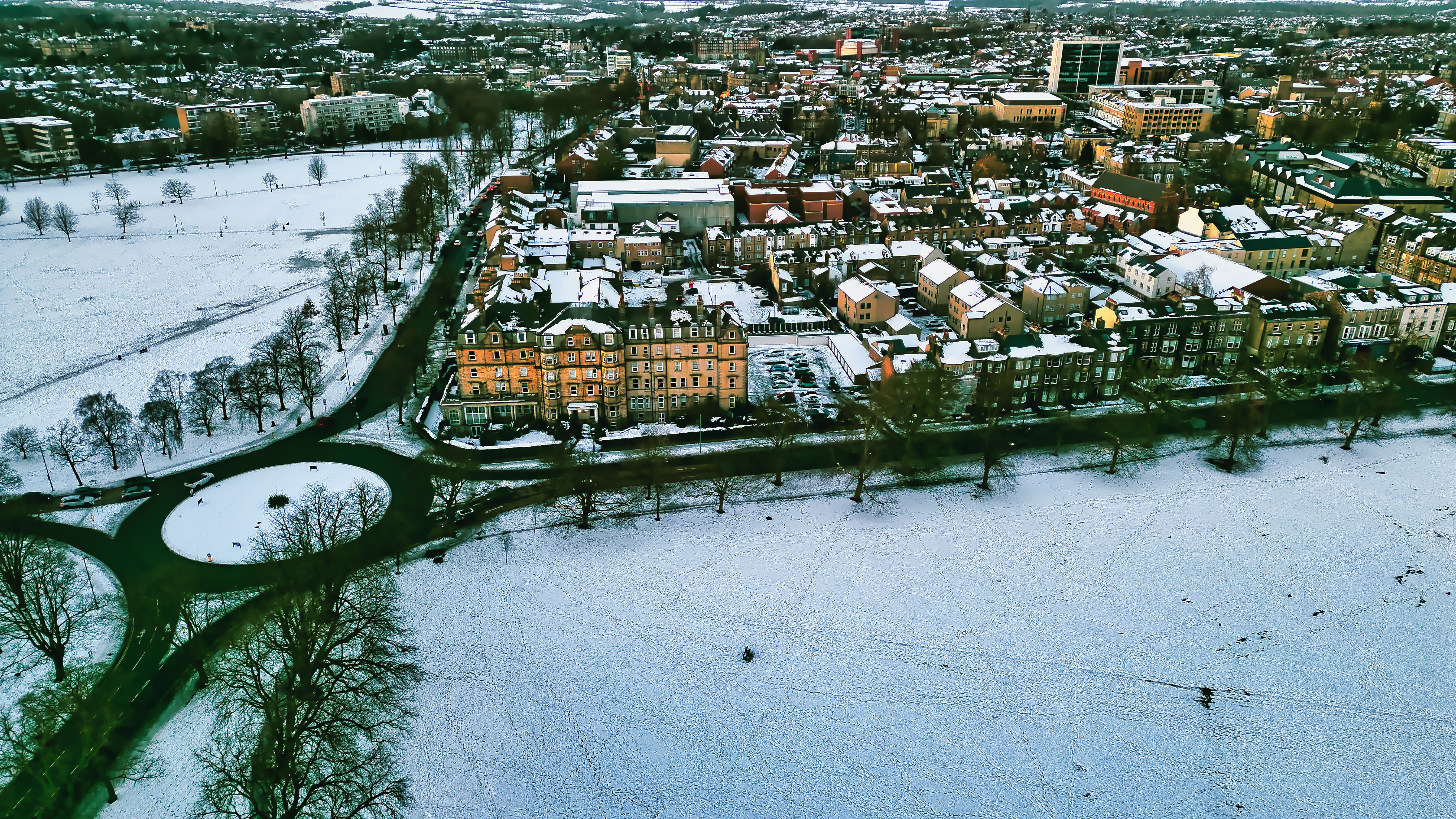 Aerial view of a snow-covered residential area near a park, featuring a large hotel and a roundabout. Buildings are predominantly light-colored, contrasting with the white snow and dark green trees in Harrogate, UK.