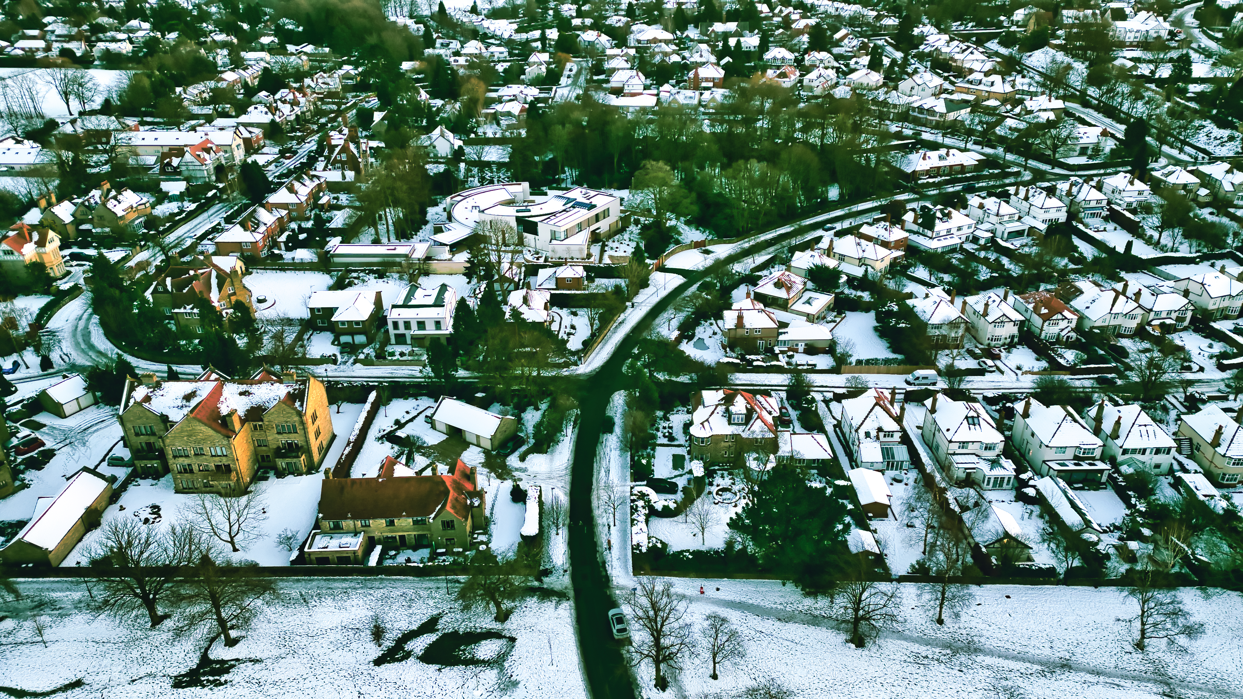 Aerial view of a snow-covered residential area, featuring various house styles, roads, and green spaces. A large building is centrally located. The overall color palette is muted with whites and greens dominating in Harrogate, UK.