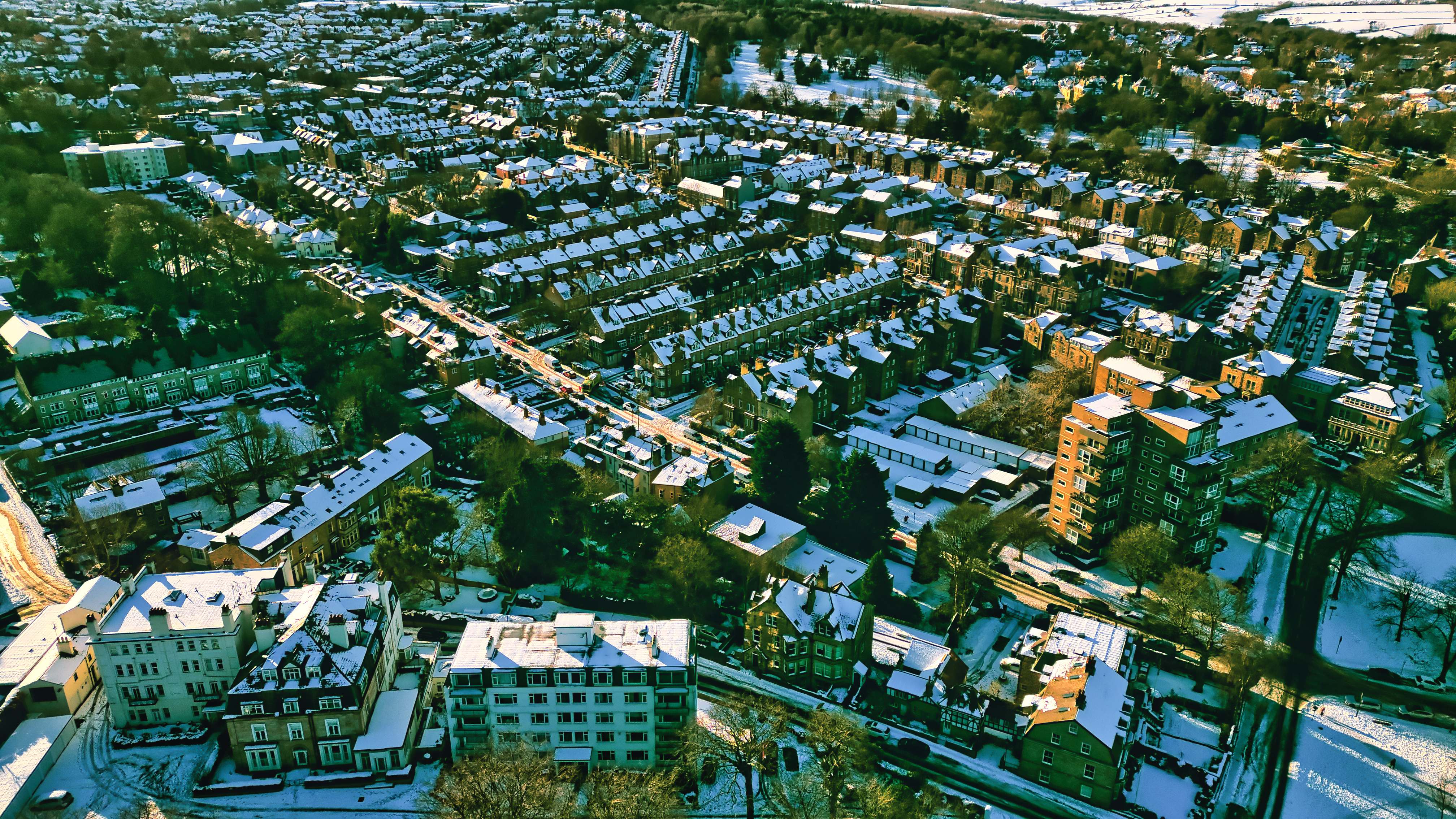 Aerial view of a snow-covered residential area, featuring houses, streets, and green spaces. Multi-story buildings and varied architectural styles are visible in Harrogate, UK.