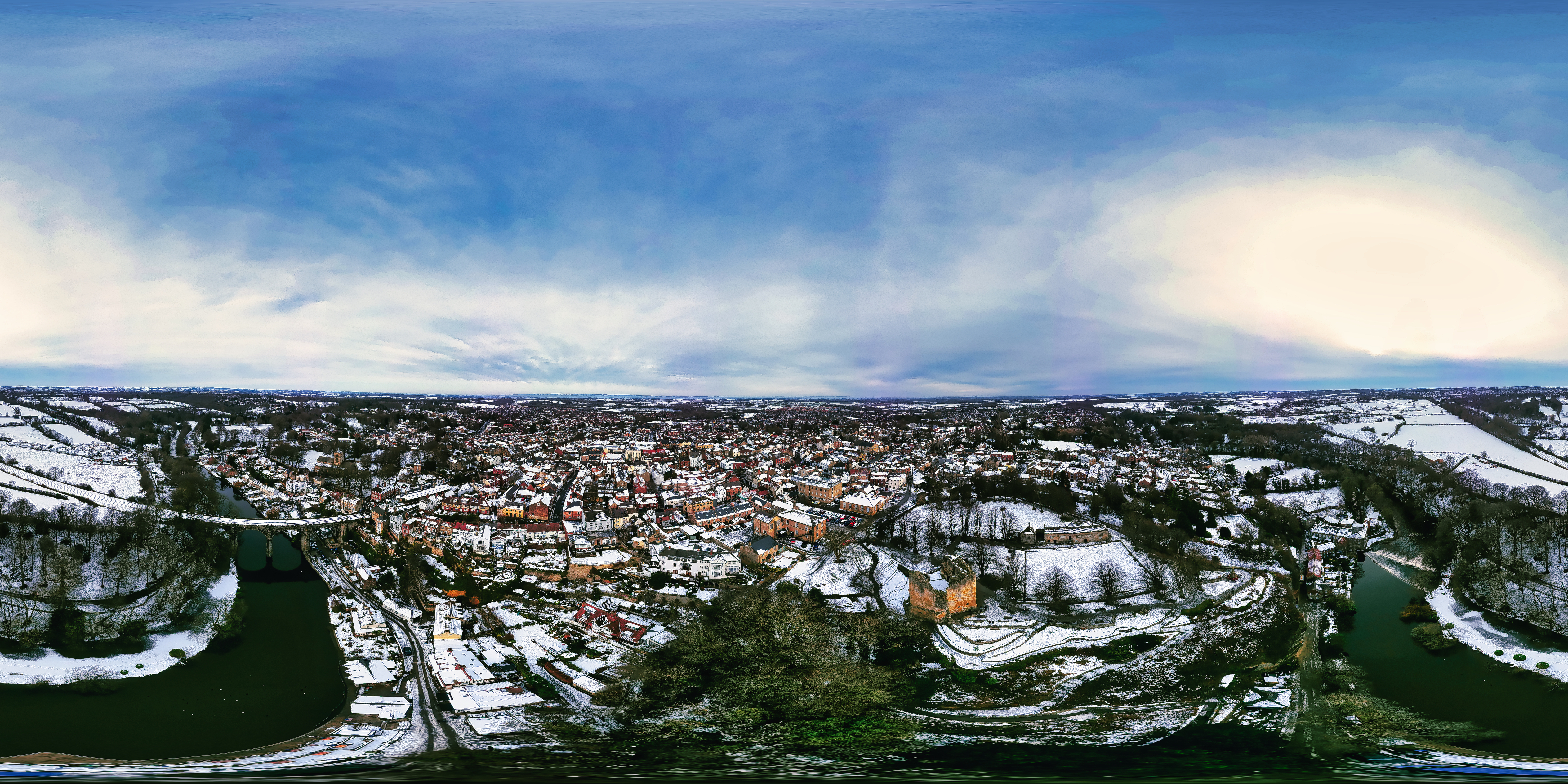 A panoramic aerial view of a snow-covered town, nestled beside a river. A bridge spans the river, with surrounding hills and countryside also covered in a light dusting of snow. The sky is partly cloudy, with blue showing through in Knaresborough, UK.