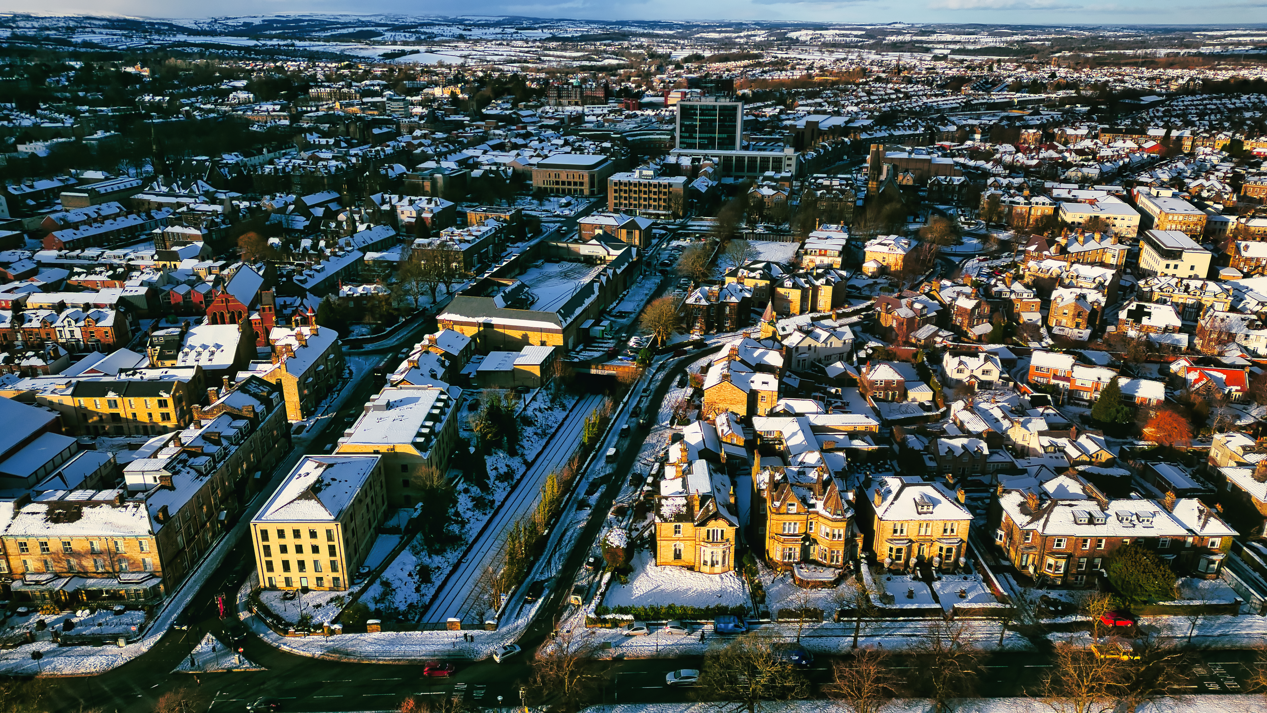 Aerial view of a snow-covered town, showcasing residential buildings, roads, and a railway line. Buildings are primarily low-rise, with varied architectural styles in Harrogate, UK.
