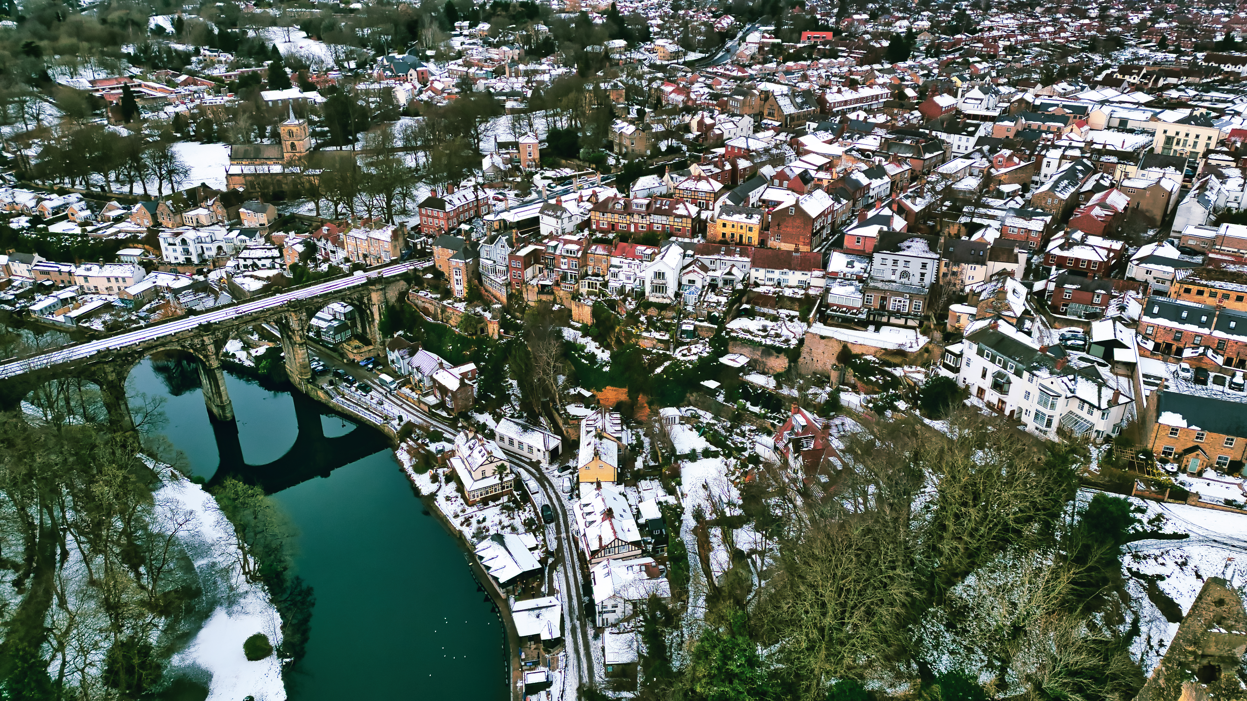 Aerial view of a snow-covered town with a river and a stone viaduct. Buildings are densely packed, showcasing varied architectural styles. The river is a deep teal in Knaresborough, UK.