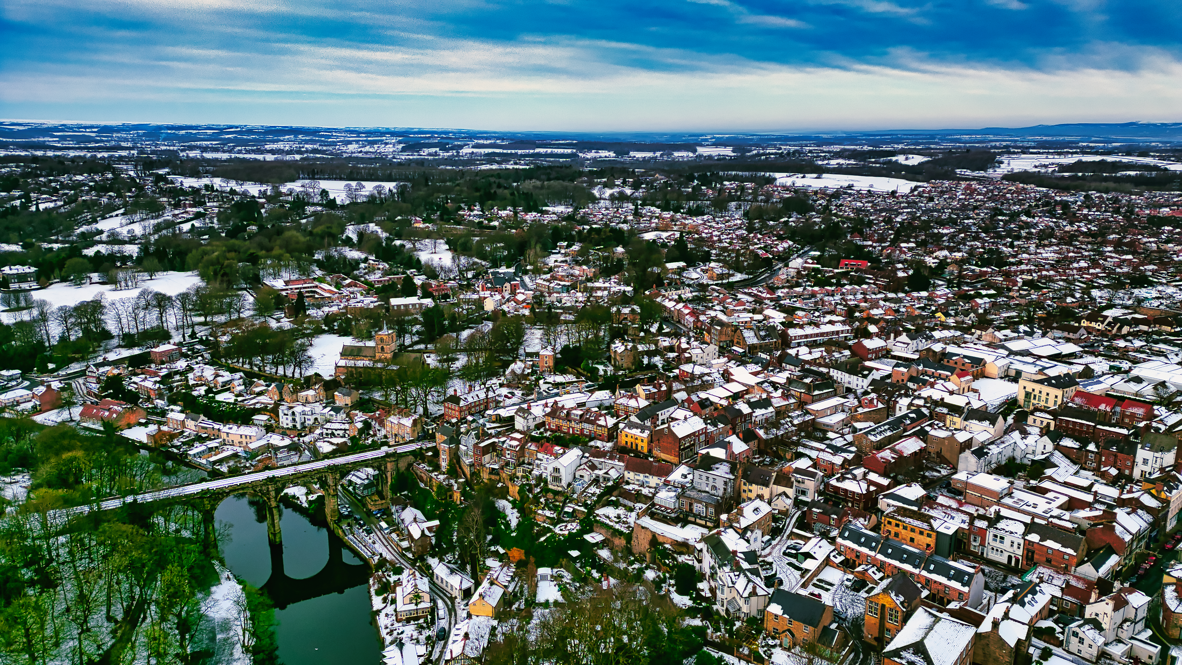 Aerial view of a snow-covered town with a viaduct and river. Buildings are densely packed, a mix of styles and colors. Surrounding landscape shows trees and open fields, also covered in snow in Knaresborough, UK.