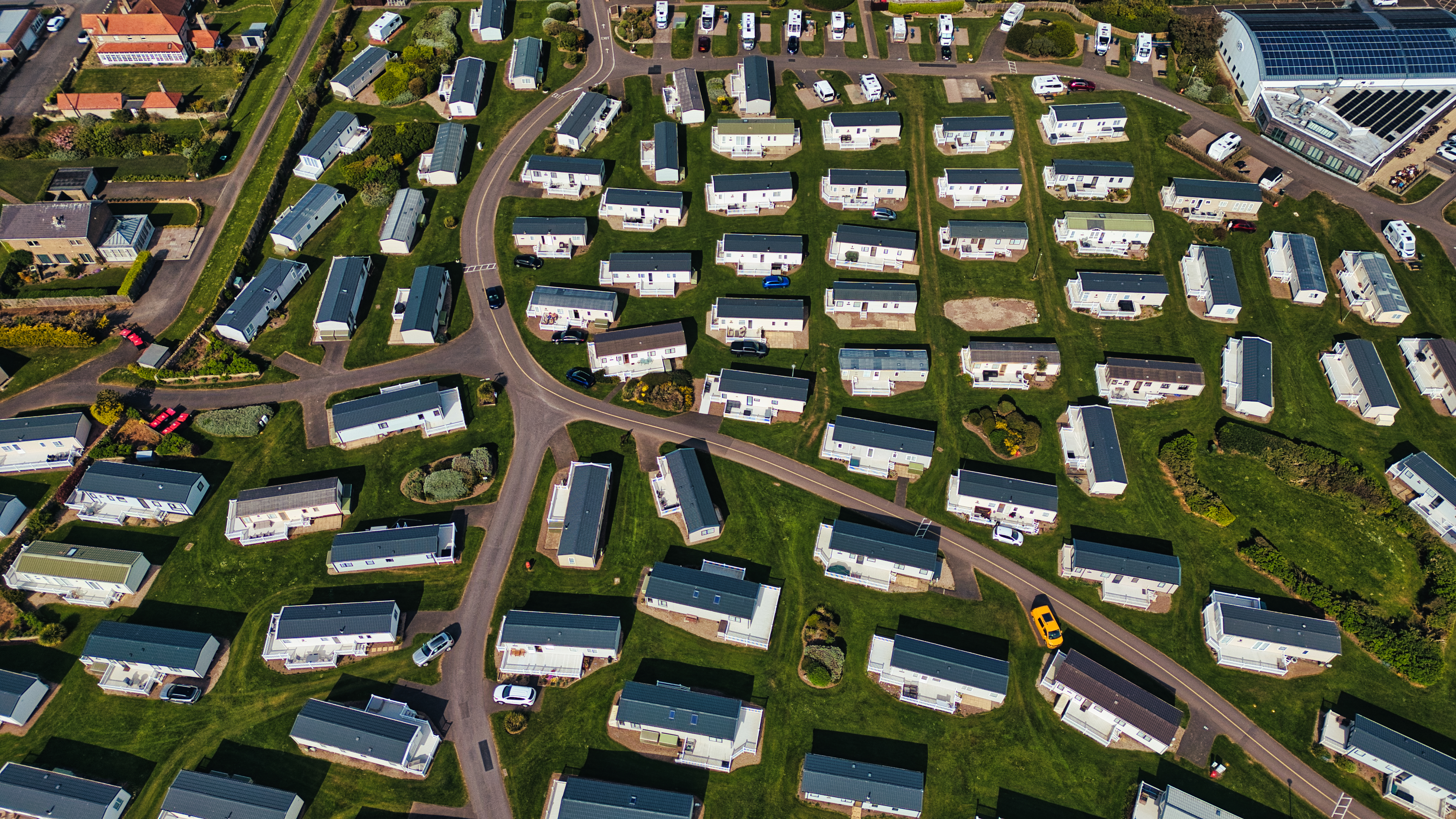 Aerial view of a static caravan park, showcasing rows of caravans, grassy areas, and roadways under a bright sky in Seahouses village, UK.