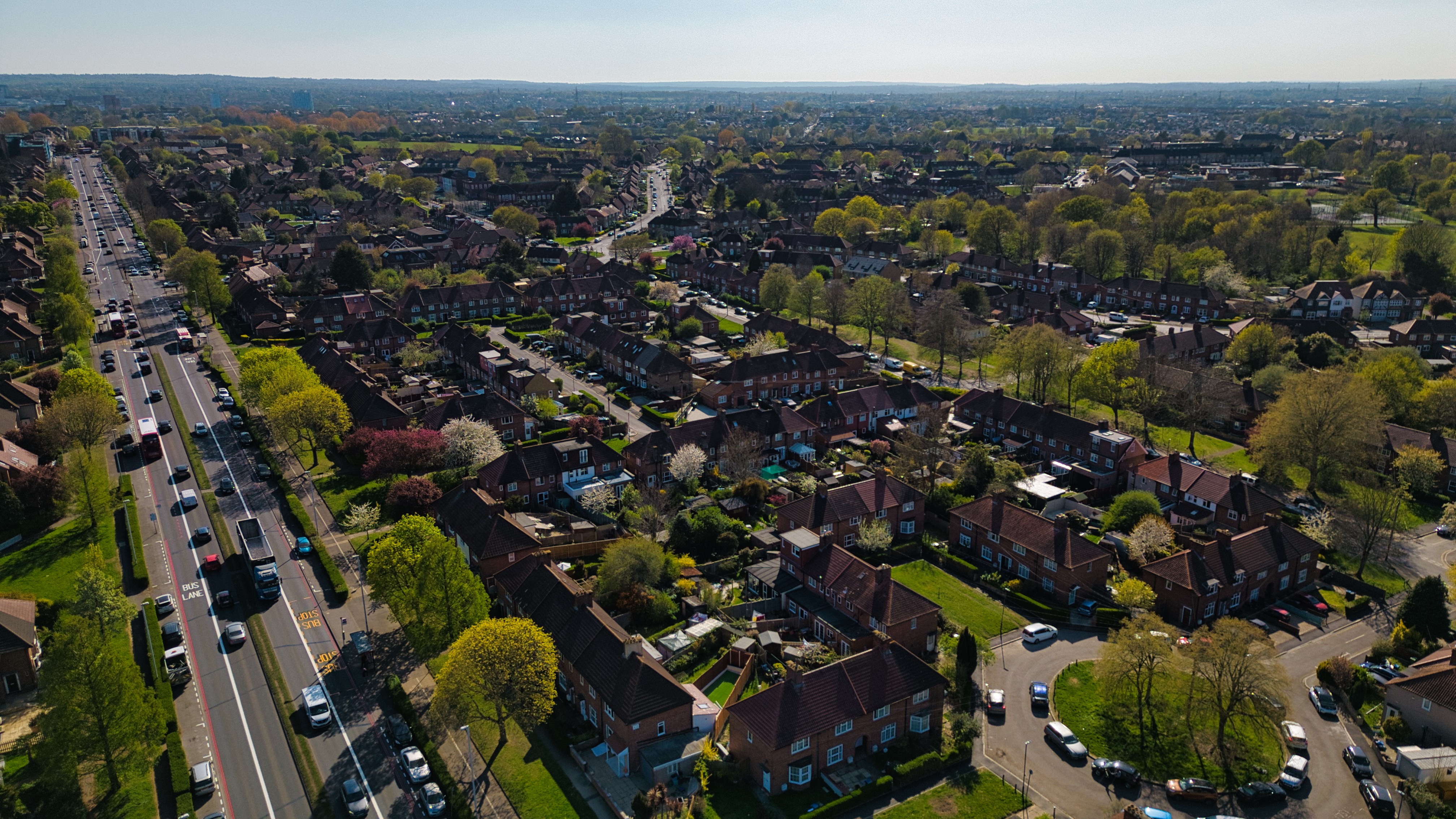 Aerial view of a suburban neighborhood with houses, roads, trees, and cars under a blue sky in Morden, London, UK.