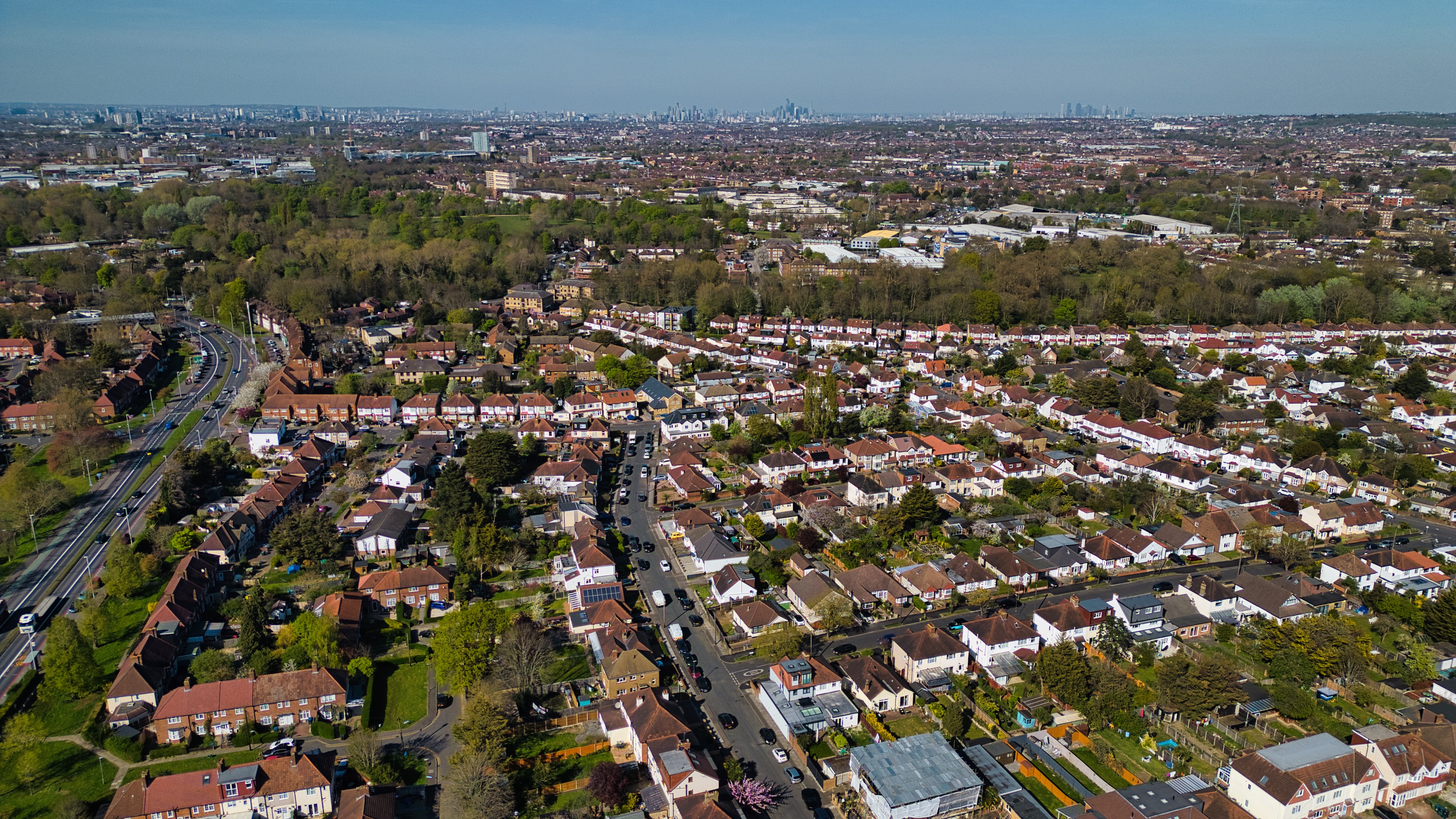 Aerial view of a dense suburban area with houses, roads, trees, and a distant cityscape under a clear blue sky in Morden, London, UK.