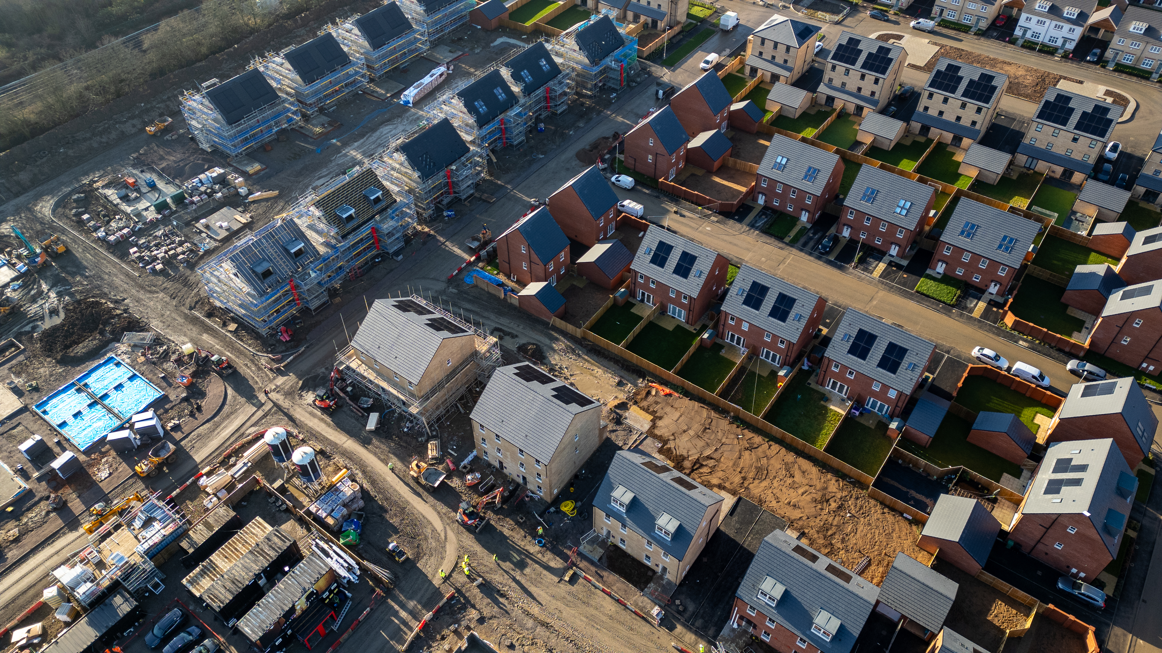 Aerial view of a suburban housing development under construction, showing various stages of building completion and landscaping at Desire by Strata Homes in Leeds, UK.