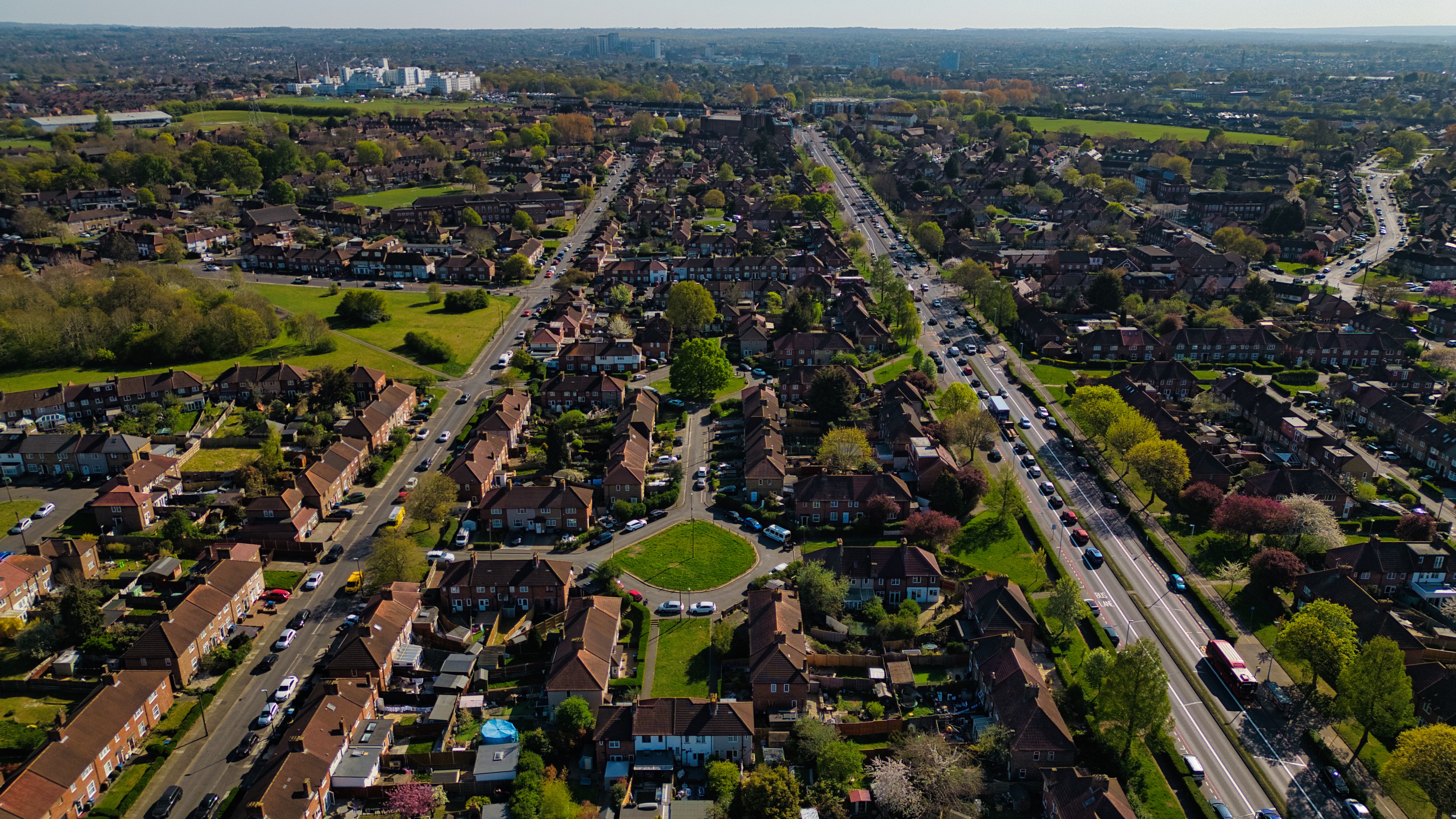 Aerial view of a suburban neighborhood with streets, houses, cars, and green spaces, taken during the day in Morden, London, UK.