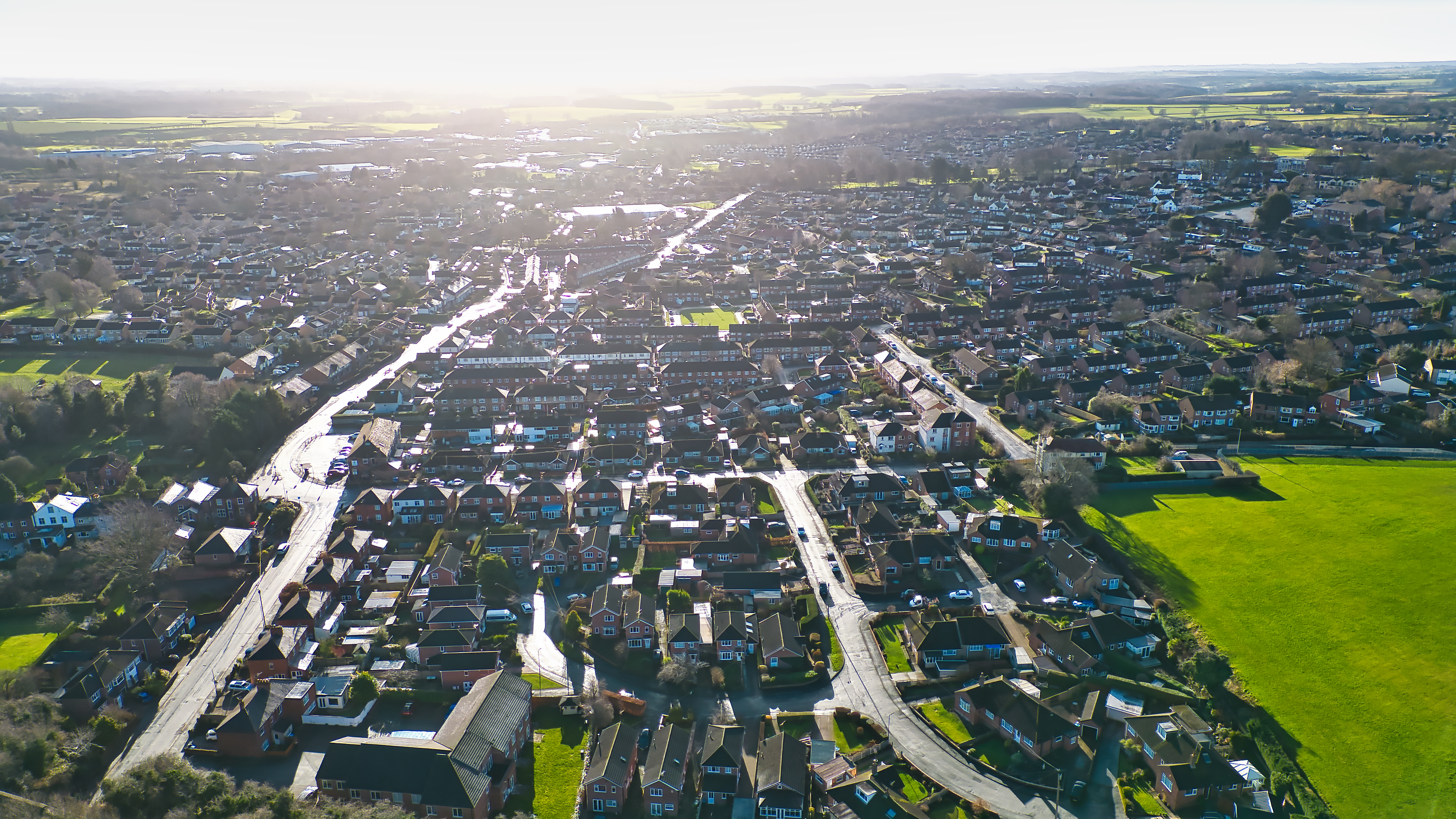 Aerial view of a residential suburban area, showing numerous houses, roads, and a large green field. The sun shines brightly, casting shadows across the rooftops in Knaresborough, UK.