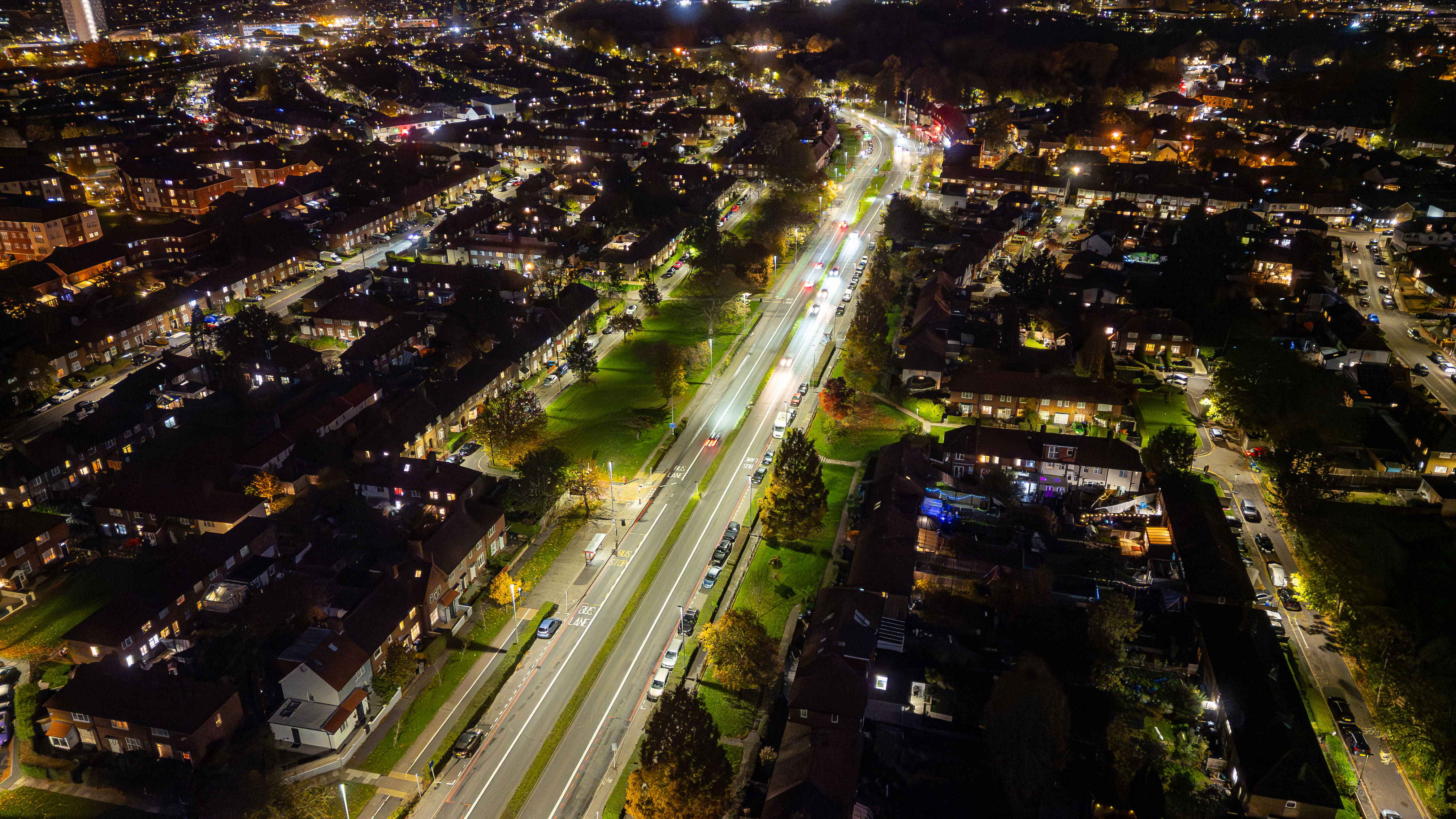 Aerial night view of a suburban street with houses, trees, and illuminated traffic lights in Morden, London.