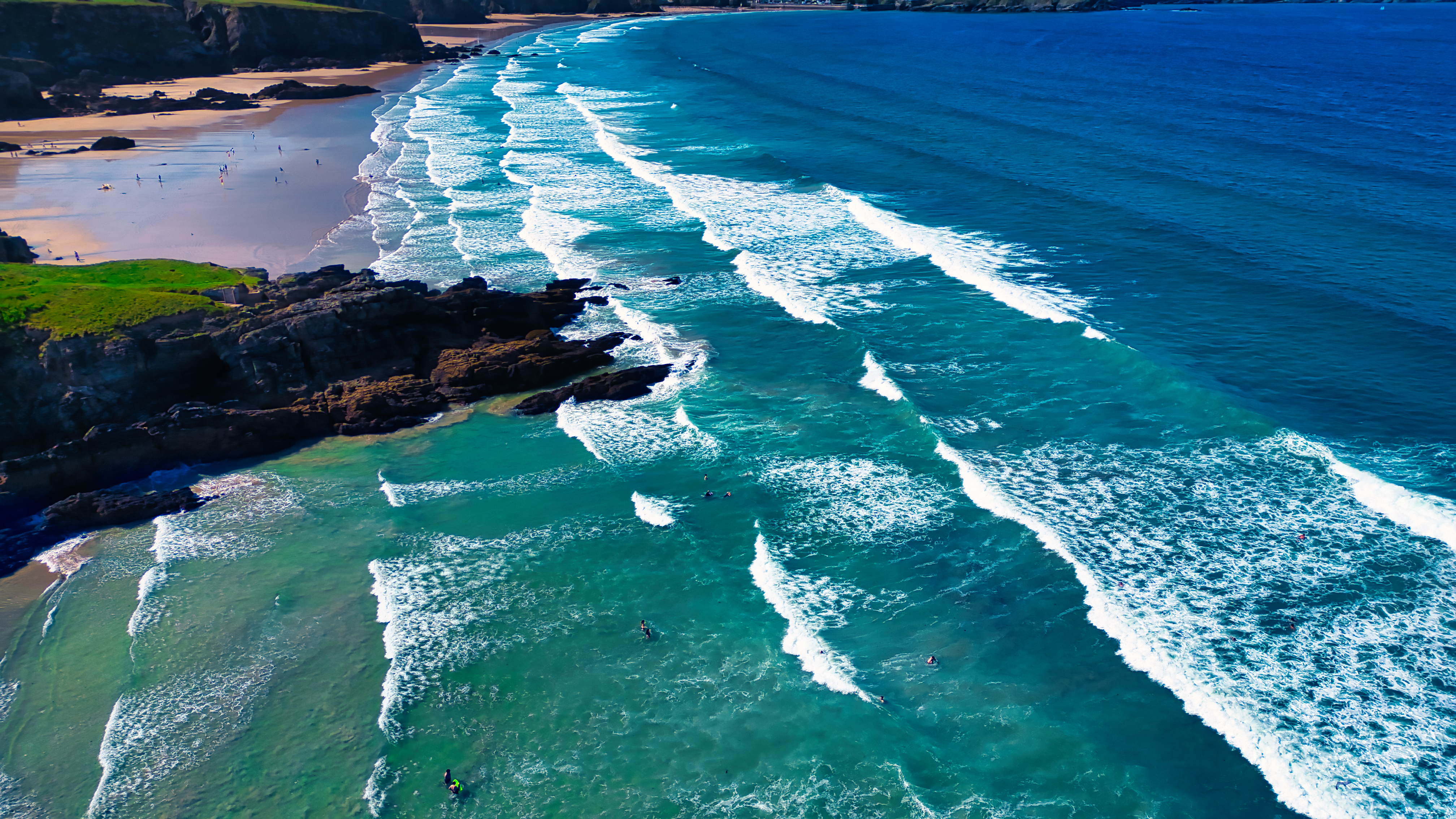 Aerial view of a beautiful beach with turquoise waters and white waves crashing onto the shore. Surfers can be seen riding the waves, while the coastline features rocky formations and lush green areas. The sky is clear and blue, creating a perfect day for beach activities.