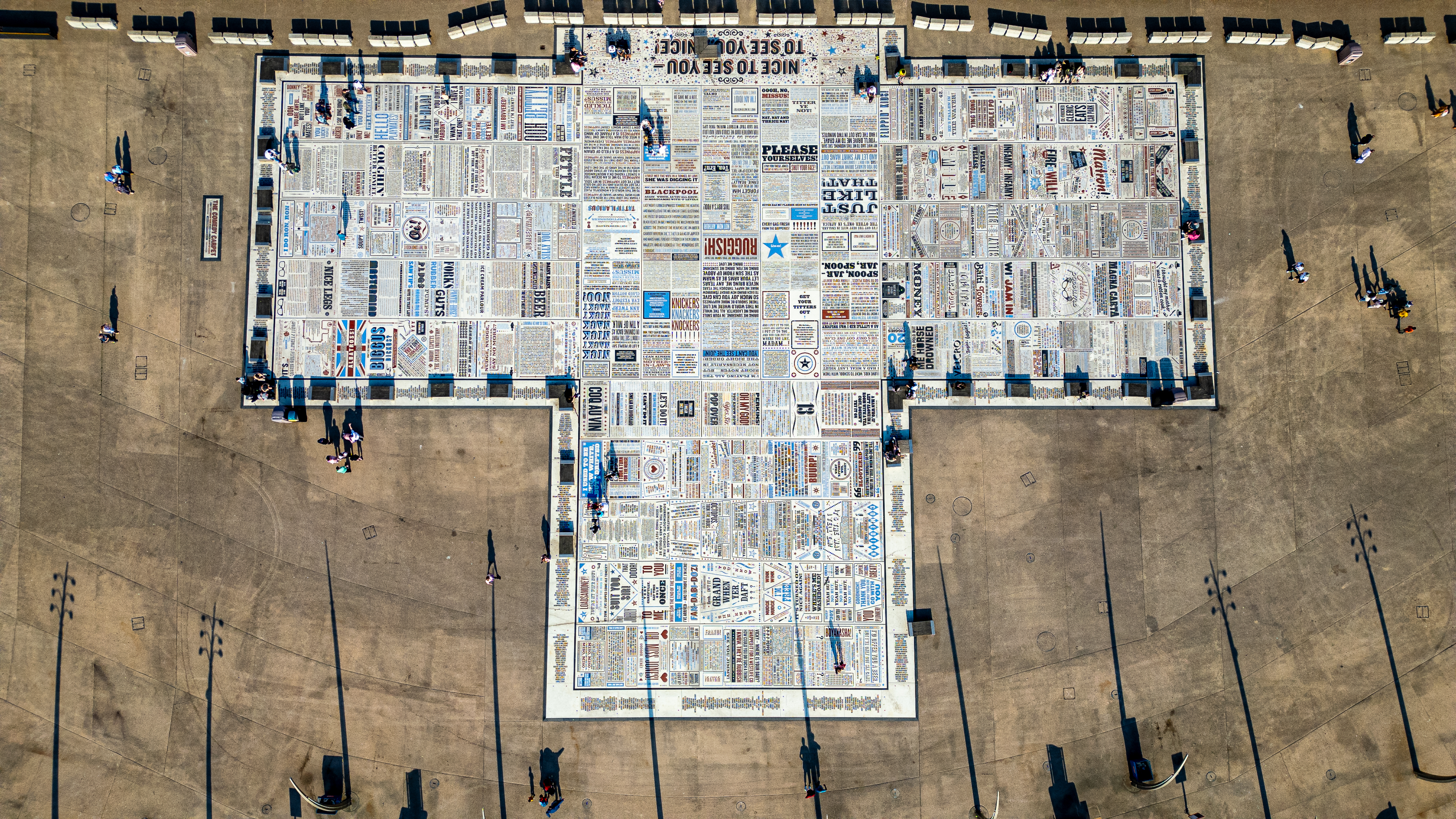Aerial view of a large, white T-shaped installation covered in text and imagery, with people walking around it on a paved surface in Blackpool, UK.
