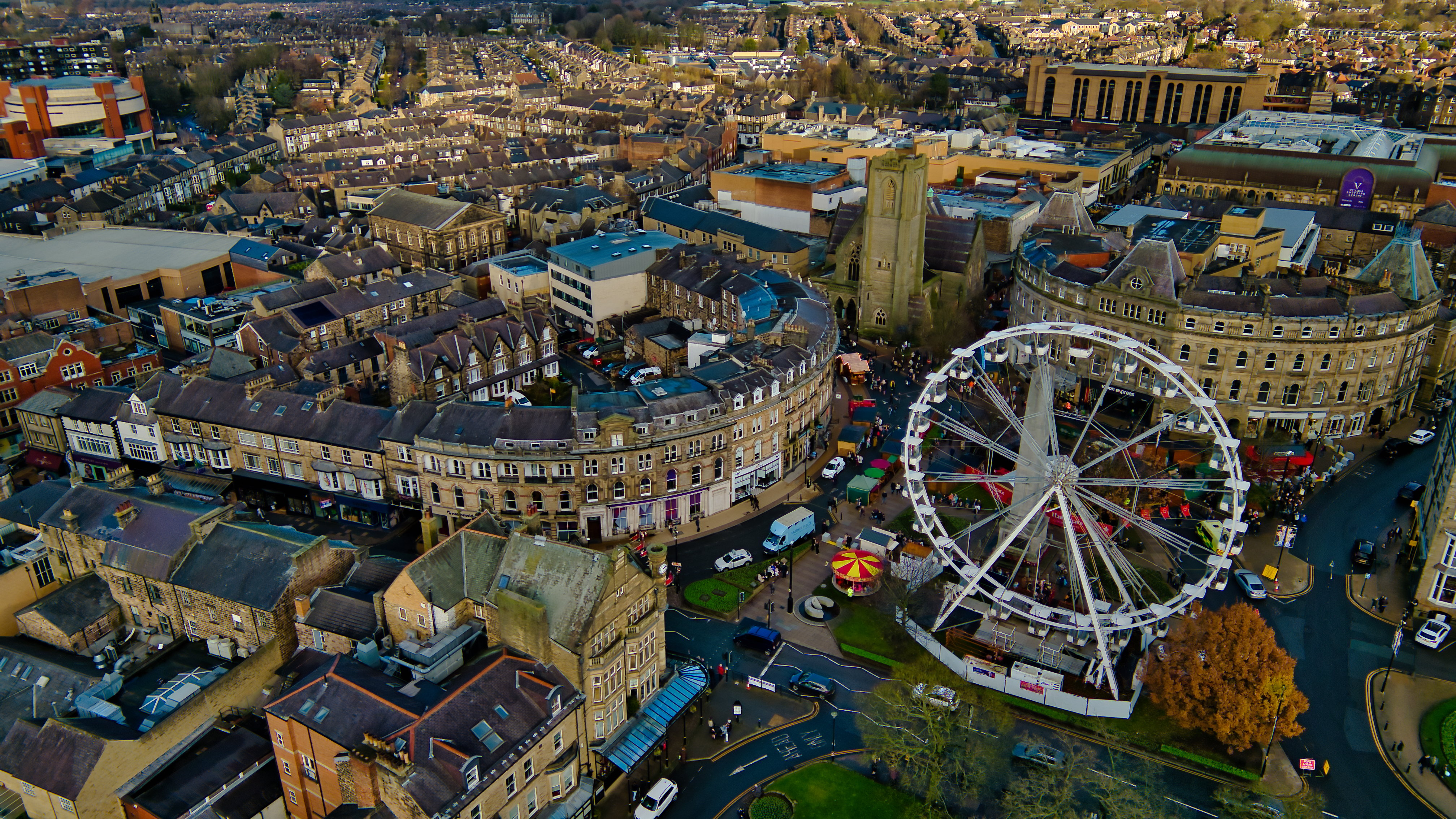 Aerial view of a town center featuring a Ferris wheel, numerous buildings, and a curved street. The architecture is predominantly stone, with a mix of commercial and residential buildings. A Christmas market is visible near the Ferris wheel.