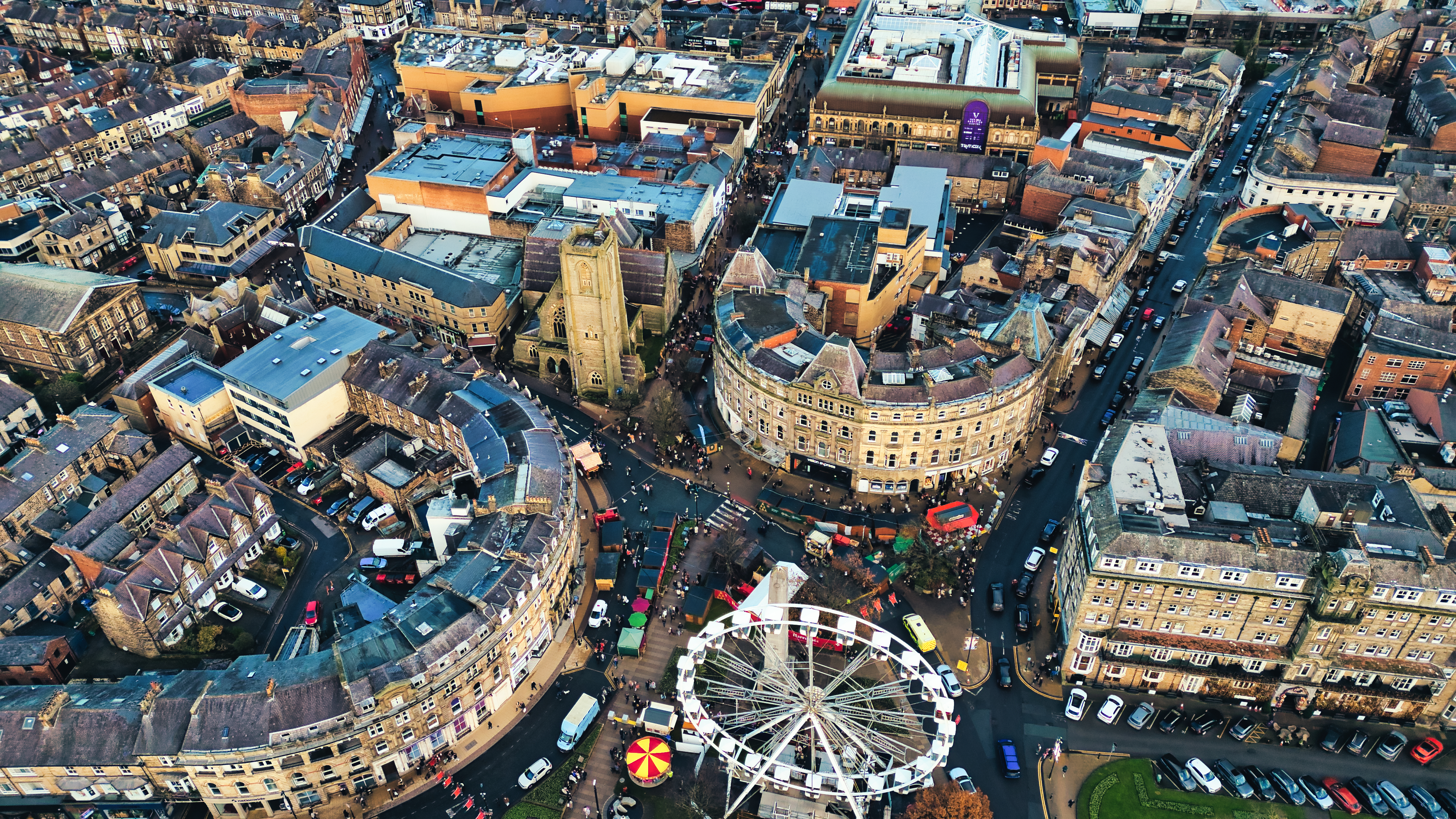 Aerial view of a town center, featuring a Ferris wheel, market stalls, and numerous buildings in varying architectural styles. The scene is dominated by stone buildings and streets filled with cars and pedestrians.