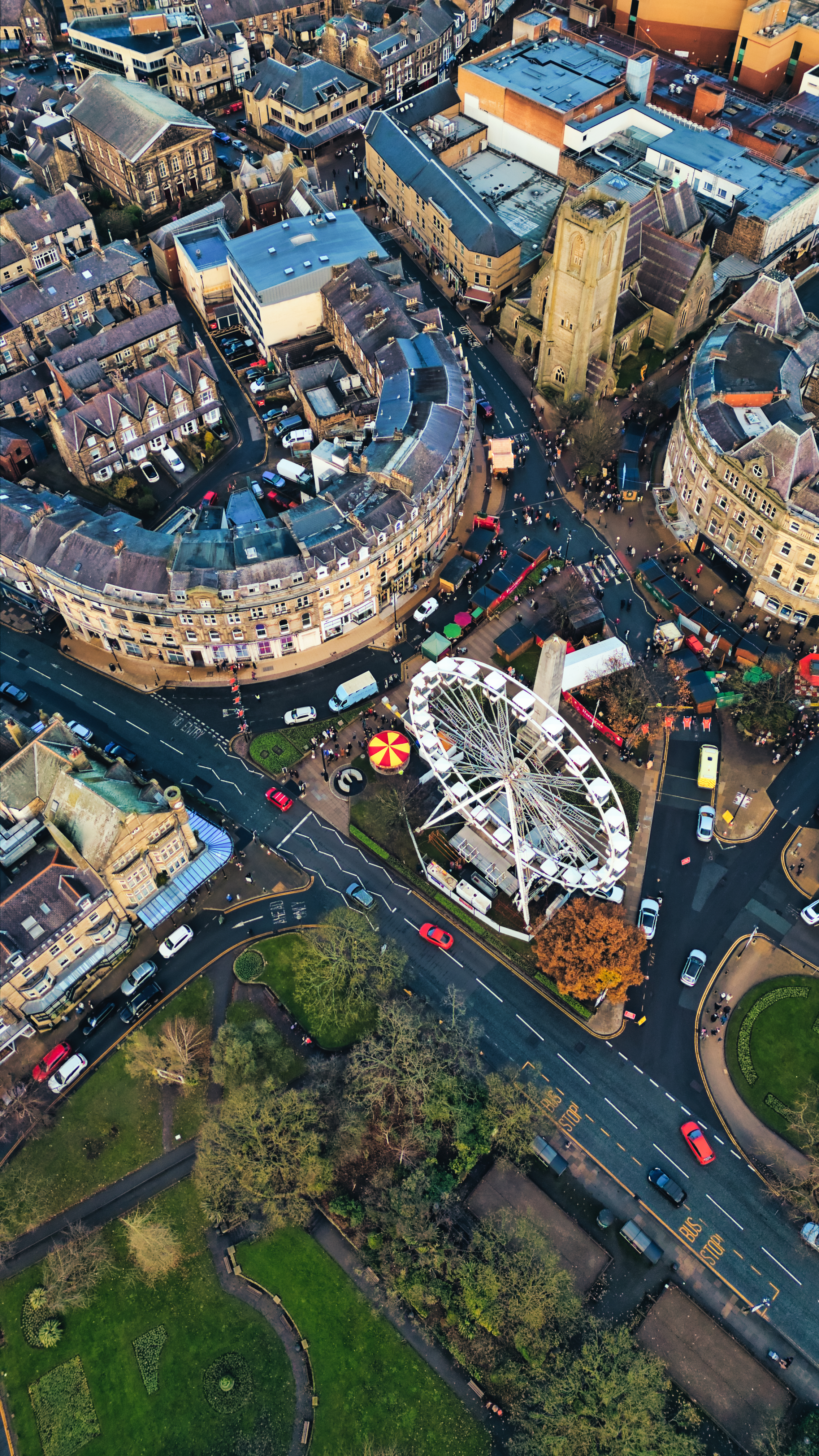 Aerial view of a town center featuring a Ferris wheel situated near a crossroads, surrounded by buildings, roads, and a park. The image shows a mix of residential and commercial architecture.