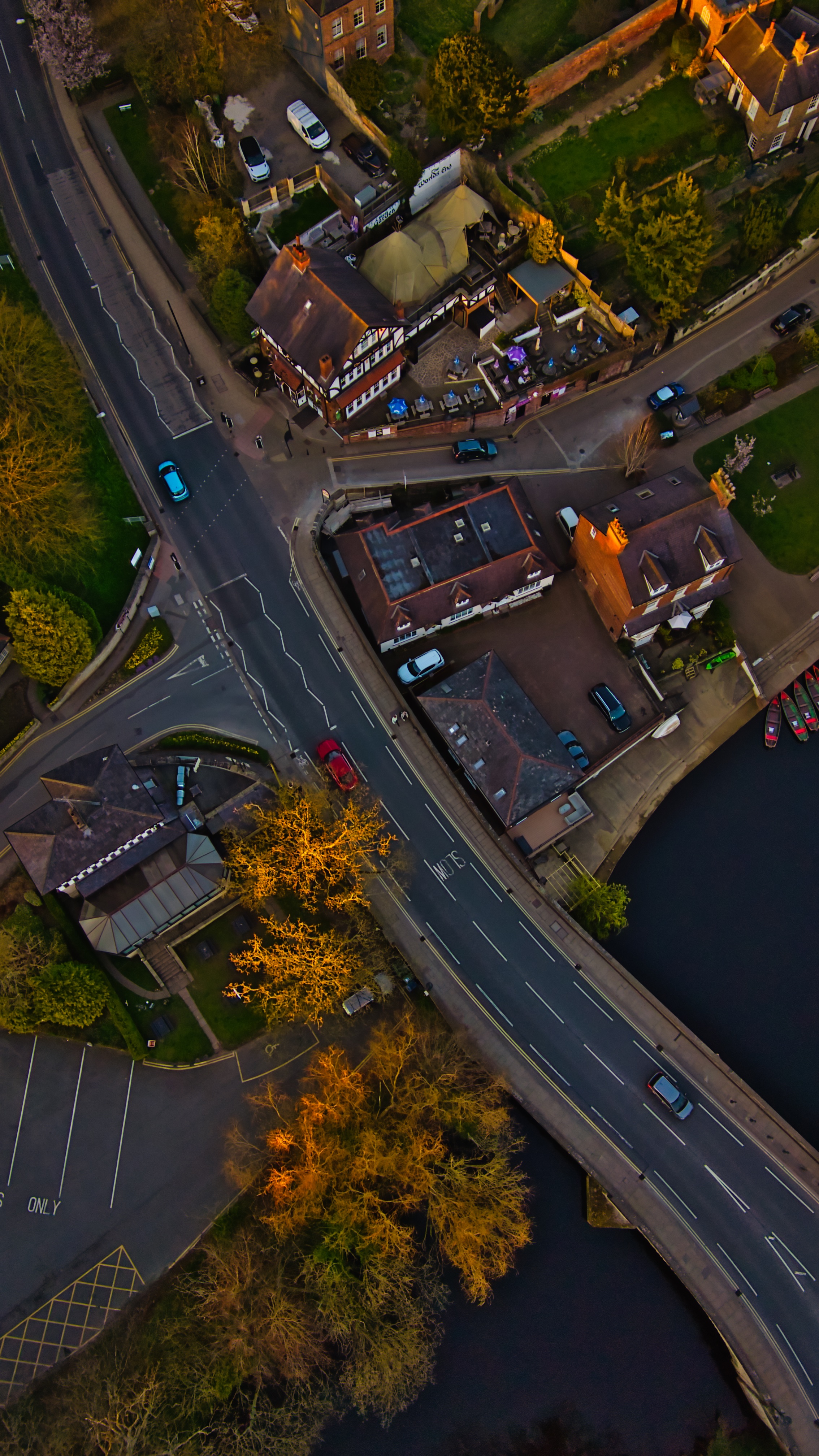 Aerial view of a town featuring buildings, roads, cars, trees, a river, and parking lot. Captured during the evening golden hour in Knaresborough, UK.
