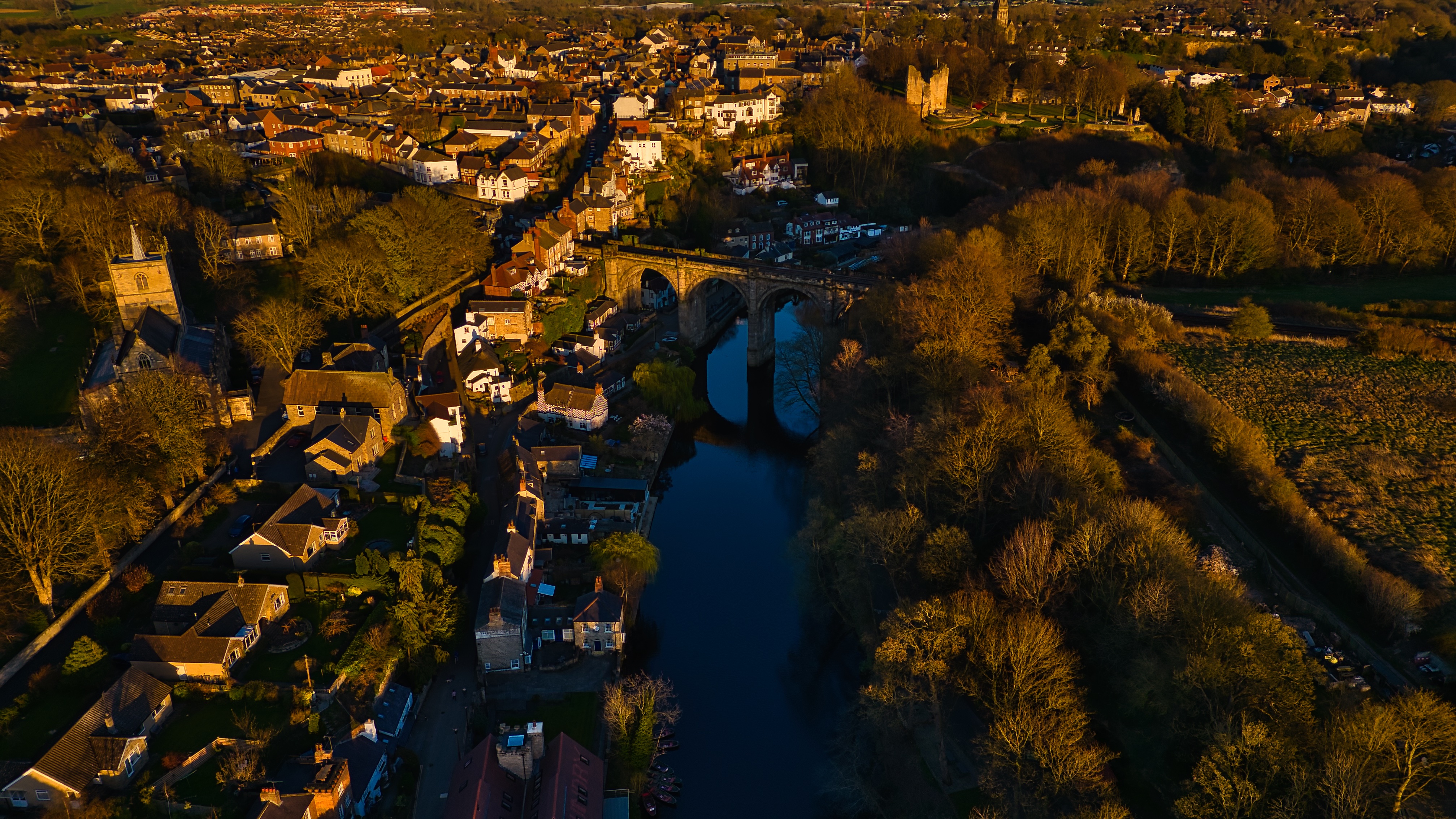 Aerial view of a town bisected by a river with a stone arch bridge, buildings, trees, and a church under warm sunlight in Knaresborough, UK.