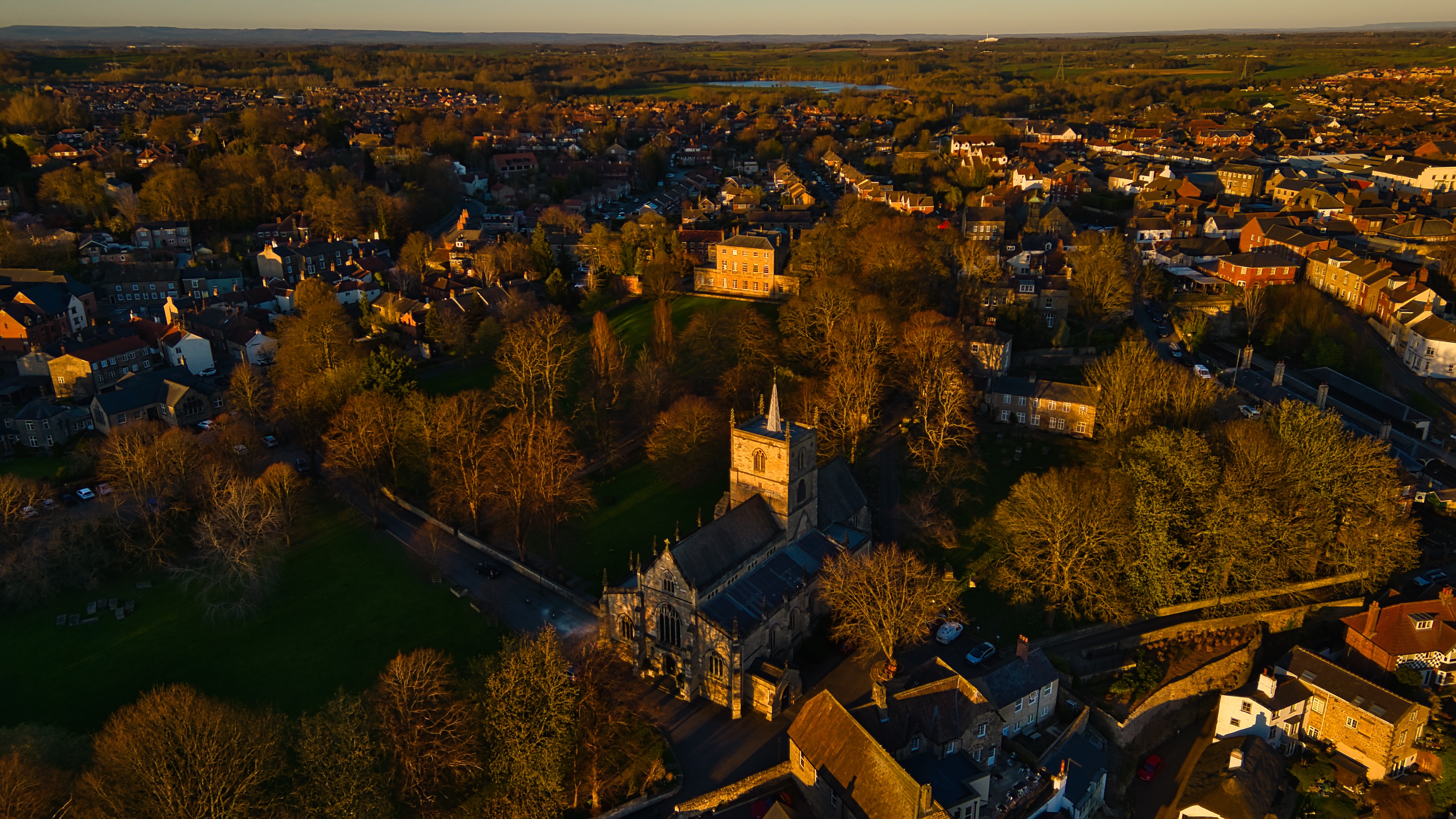Aerial view of a town featuring a prominent church, houses, trees, and a lake in the distance during golden hour in Knaresborough, UK.
