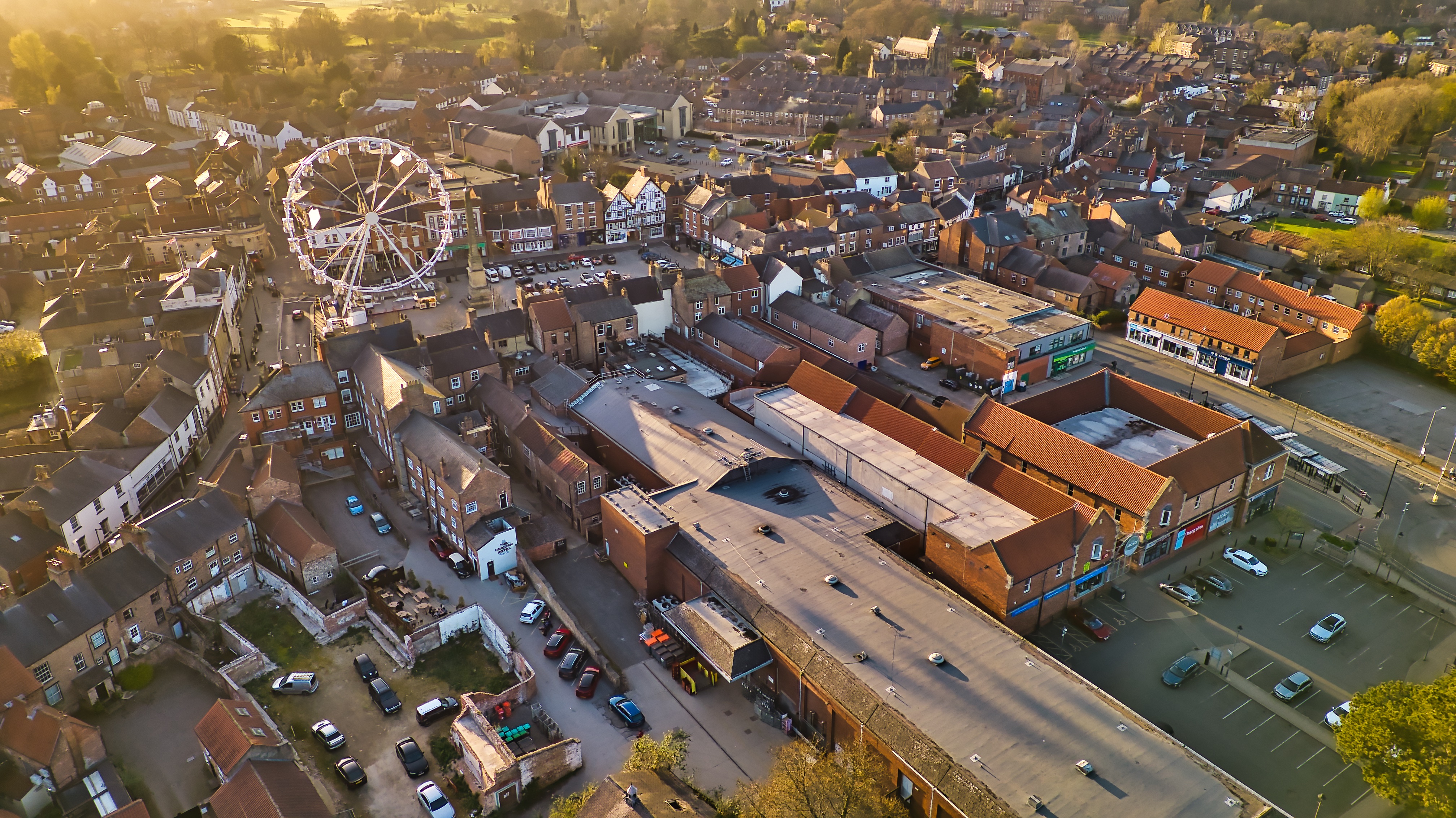 Aerial view of a town featuring buildings, a Ferris wheel, and various vehicles under a golden-hour sunlight in Ripon, UK.
